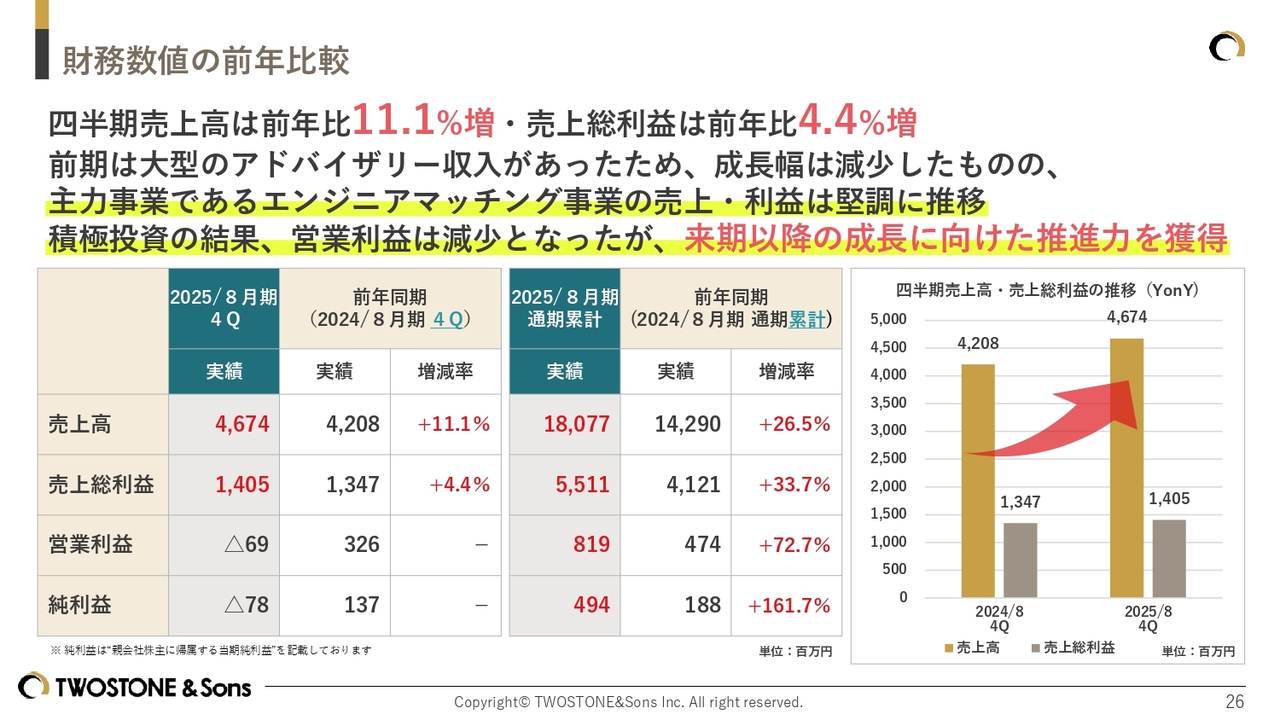 前述の売上の2026年8月期へのずれ込みに加え、積極的な投資を行った影響もあり、第4四半期の営業利益はマイナスで着地しました。しかし、2026年8月期以降に収益を生み出すコンサルタント・エンジニアを多数獲得できたことで、2026年8月期以降の成長に向けた推進力を得られたと考えています。