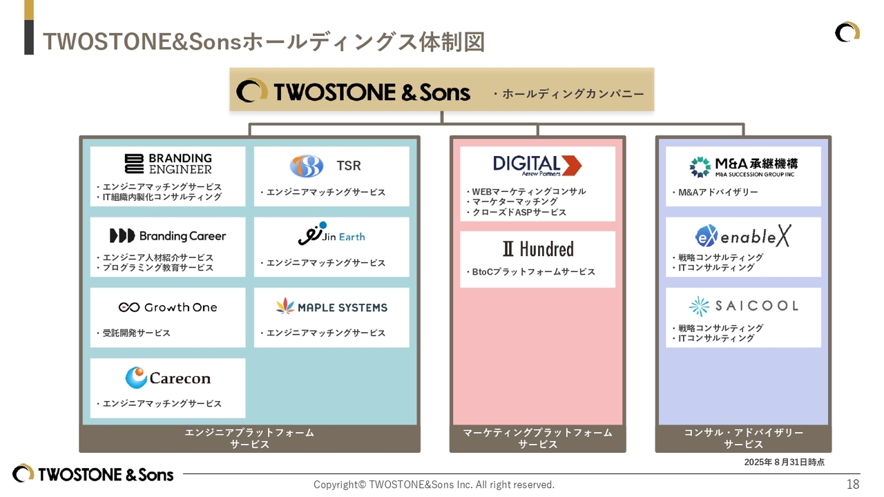 こちらのスライドはホールディングスの体制図です。祖業である「Midworks」を中心に、エンジニアプラットフォームサービスに加え、Webマーケティング関連サービスや戦略コンサルティング、M&Aアドバイザリー事業などを展開しています。
