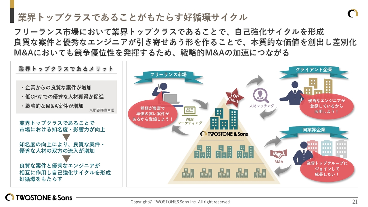 知名度の向上により、好循環サイクルの例として、市場からは優秀なフリーランス人材が集まり、クライアント企業からは種類が豊富で単価が高いなどの良質な案件が流入してきます。