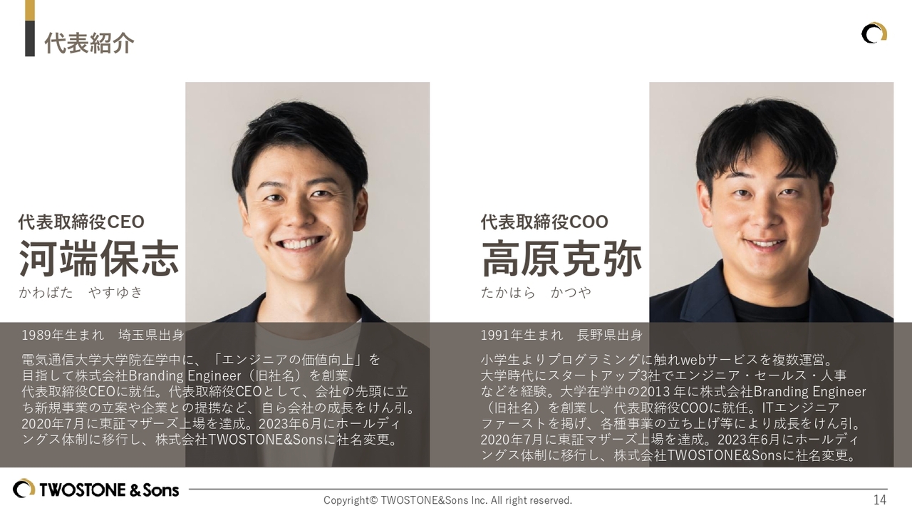ここであらためて、私の自己紹介をします。私は1989年生まれ、埼玉県出身です。大学院在学中に、「エンジニアの価値向上」を目指し、共同代表の代表取締役COOである高原とともに、資本金10万円で創業しました。当時、私は大学院生で、高原は大学生でした。