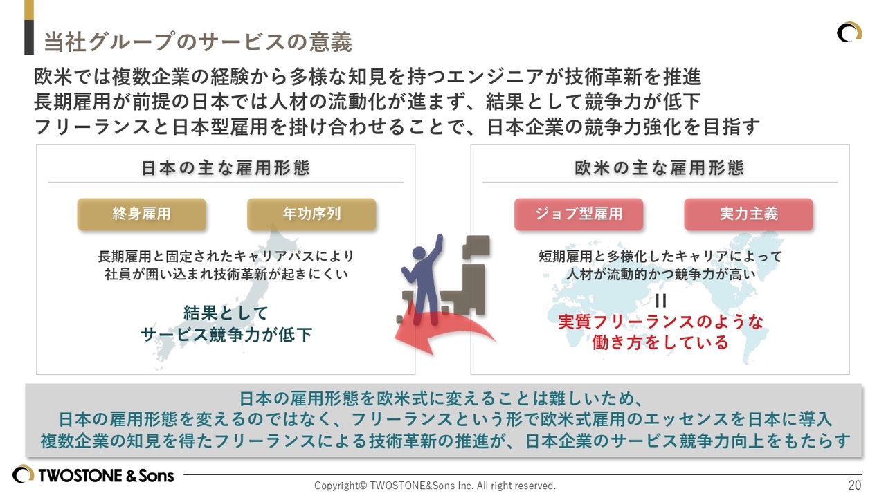 日本の雇用形態を欧米式に変えることは難しいと考えていますが、当社はフリーランスという形態を活用することで、欧米式雇用のエッセンスを日本に導入する取り組みを進めているといえます。