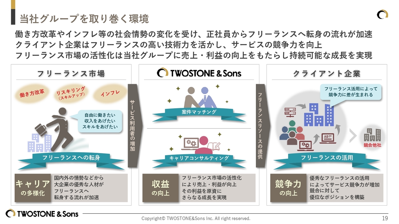 当社を取り巻く環境は、フリーランス、クライアント企業、そして当社にとって、それぞれがWin-Winとなる状態となっています。