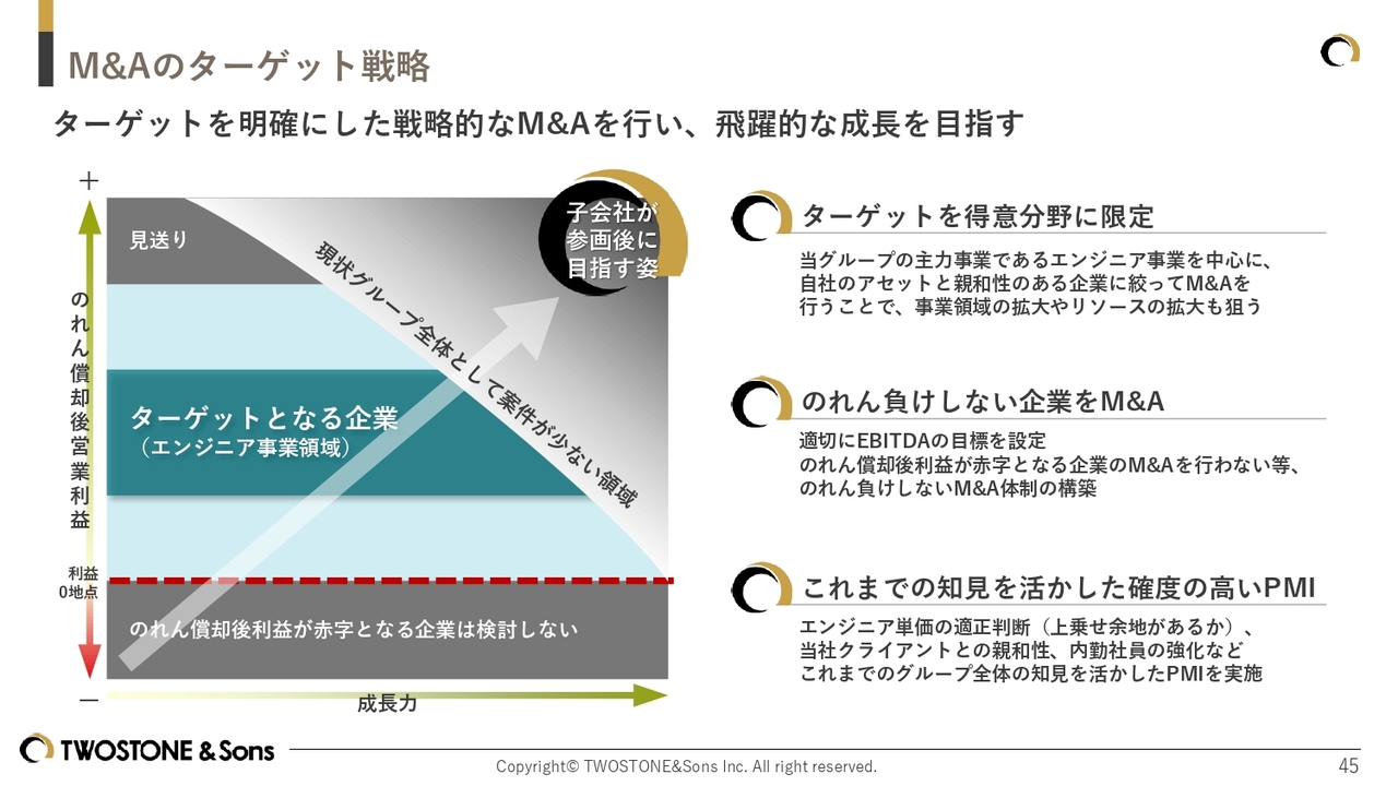 M&Aのターゲット戦略についてです。当社では、ターゲットを明確にした戦略的なM&Aを基本としています。「得意分野に限定したターゲットの選定」「のれん負けしない企業をM&Aすること」、そして「これまでの知見を活かした確度の高いPMIの実施」、この3点を軸に展開していきます。