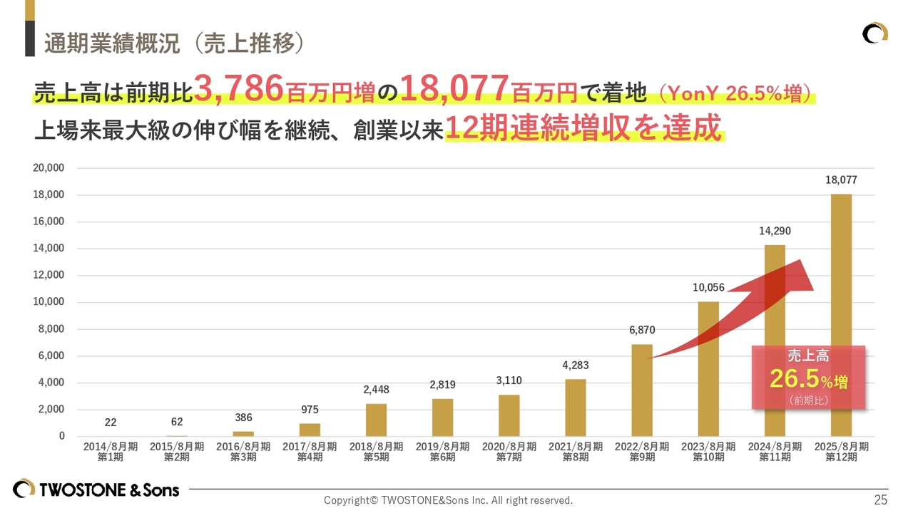 河端保志氏:こんばんは。株式会社TWOSTONE&Sons代表取締役CEOの河端です。本日はお忙しい中、お時間をいただき、本当にありがとうございます。さっそくですが、2025年8月期通期決算についてご説明します。