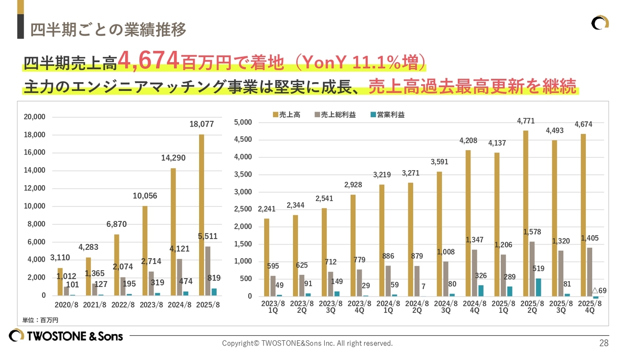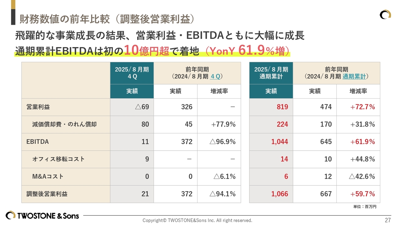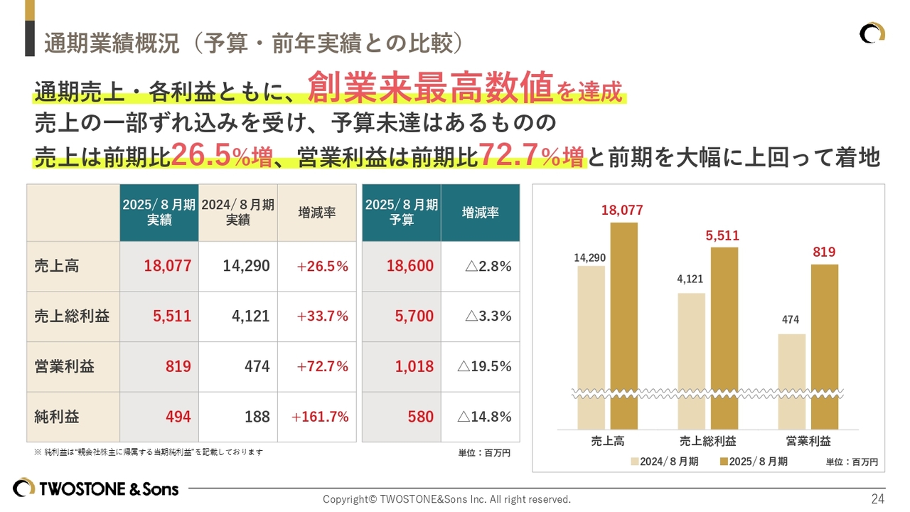 【QAあり】TWOSTONE&Sons、組織体制強化に伴う積極的な戦略的投資を継続するも、営業利益は前年比+72.7%と大幅に伸長