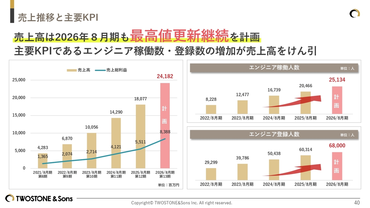 売上高も過去最高を更新する計画です。年間のエンジニア稼働人数は2万5,000人超、登録者は6万8,000人超を見込み、2026年8月期も主力事業であるエンジニアマッチング事業が全社の売上高を牽引していきます。