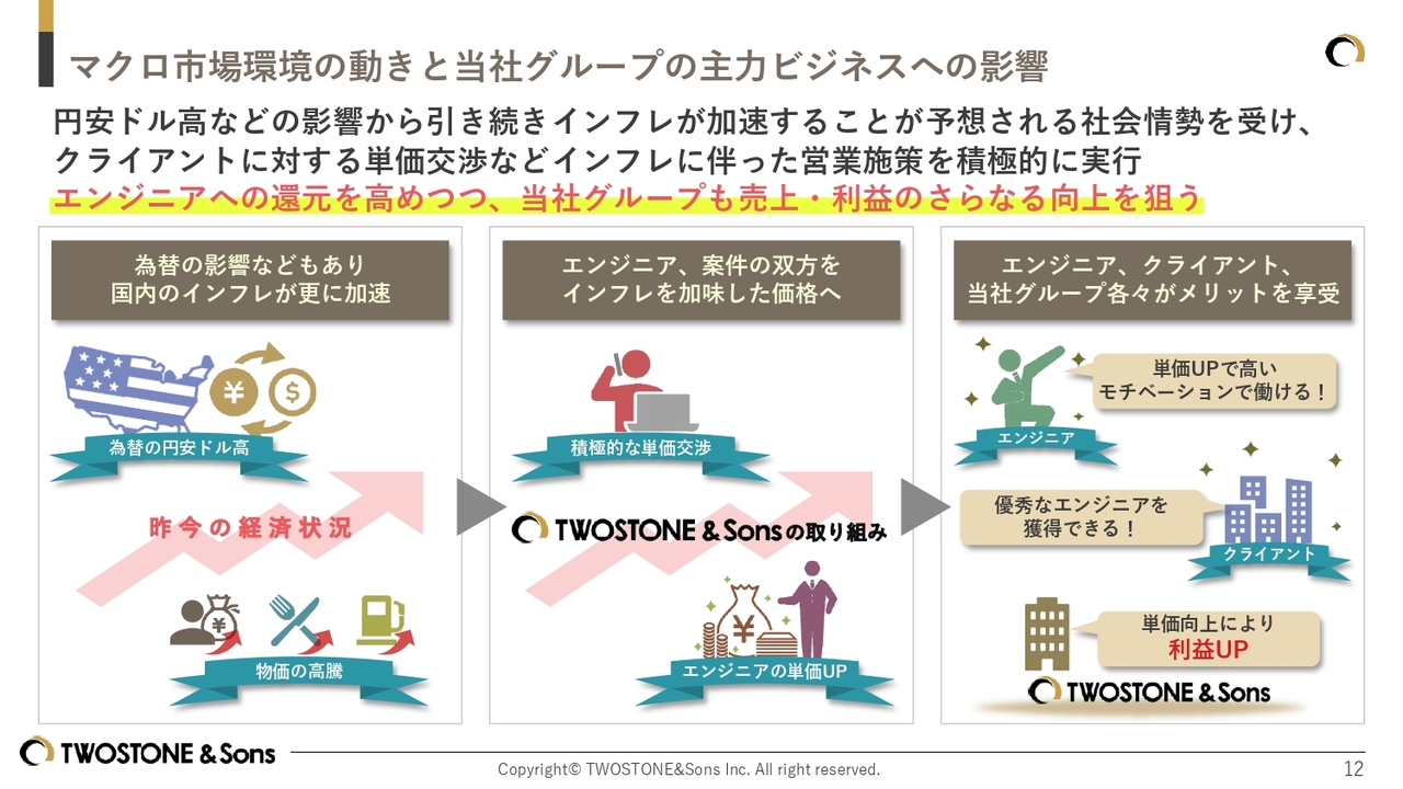 このような情勢下において、当社グループはクライアントに対する単価交渉など、インフレに対応した営業施策を積極的に実行していきます。