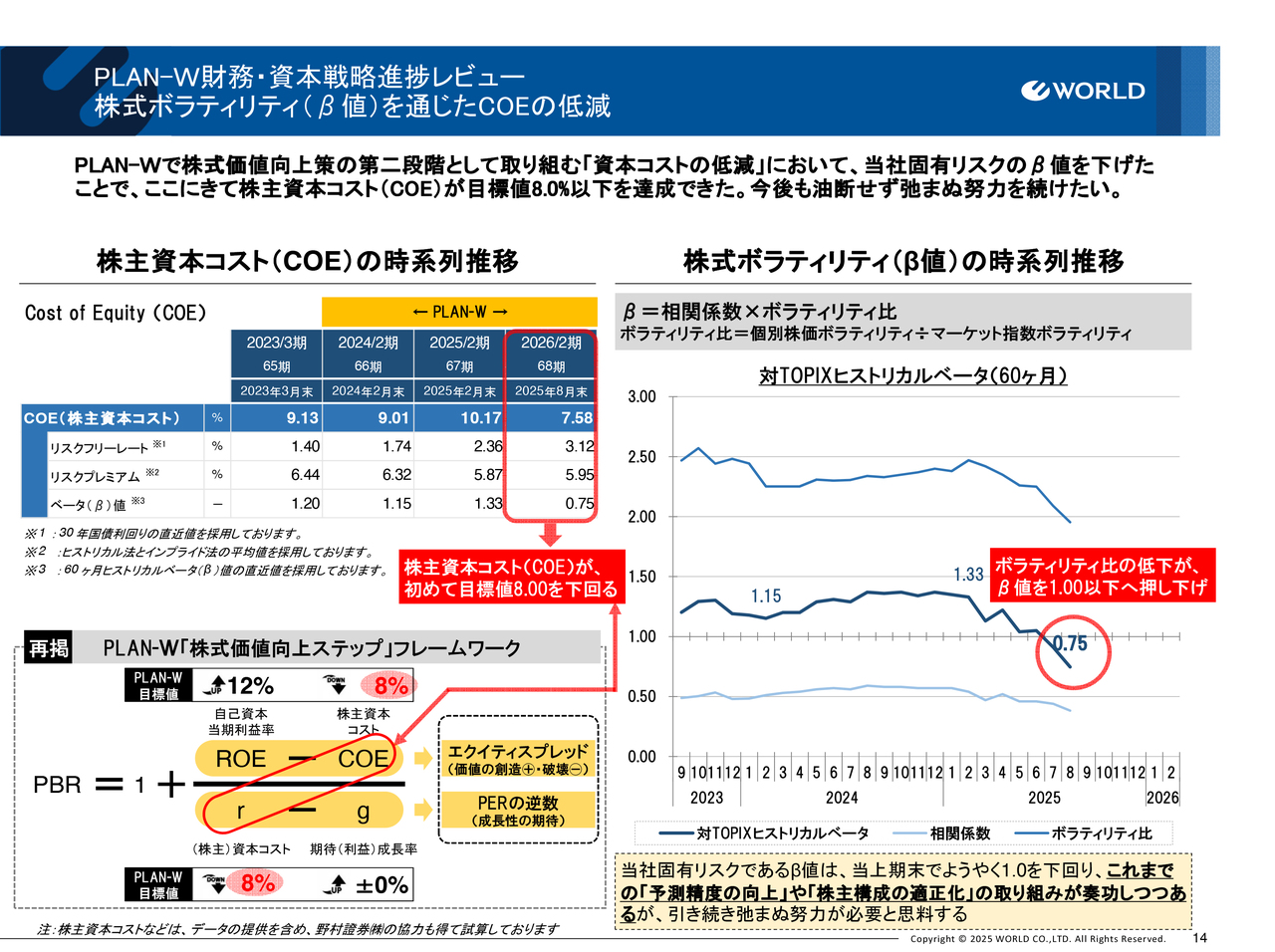次のページには、先ほど申し上げた株主資本コスト(COE)低減の根拠が示されています。スライド右側のグラフをご覧ください。当社株式のボラティリティ比率が低下した結果、ヒストリカルベータ値は8月末時点で0.75まで低下しました。