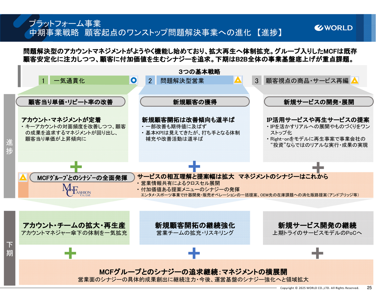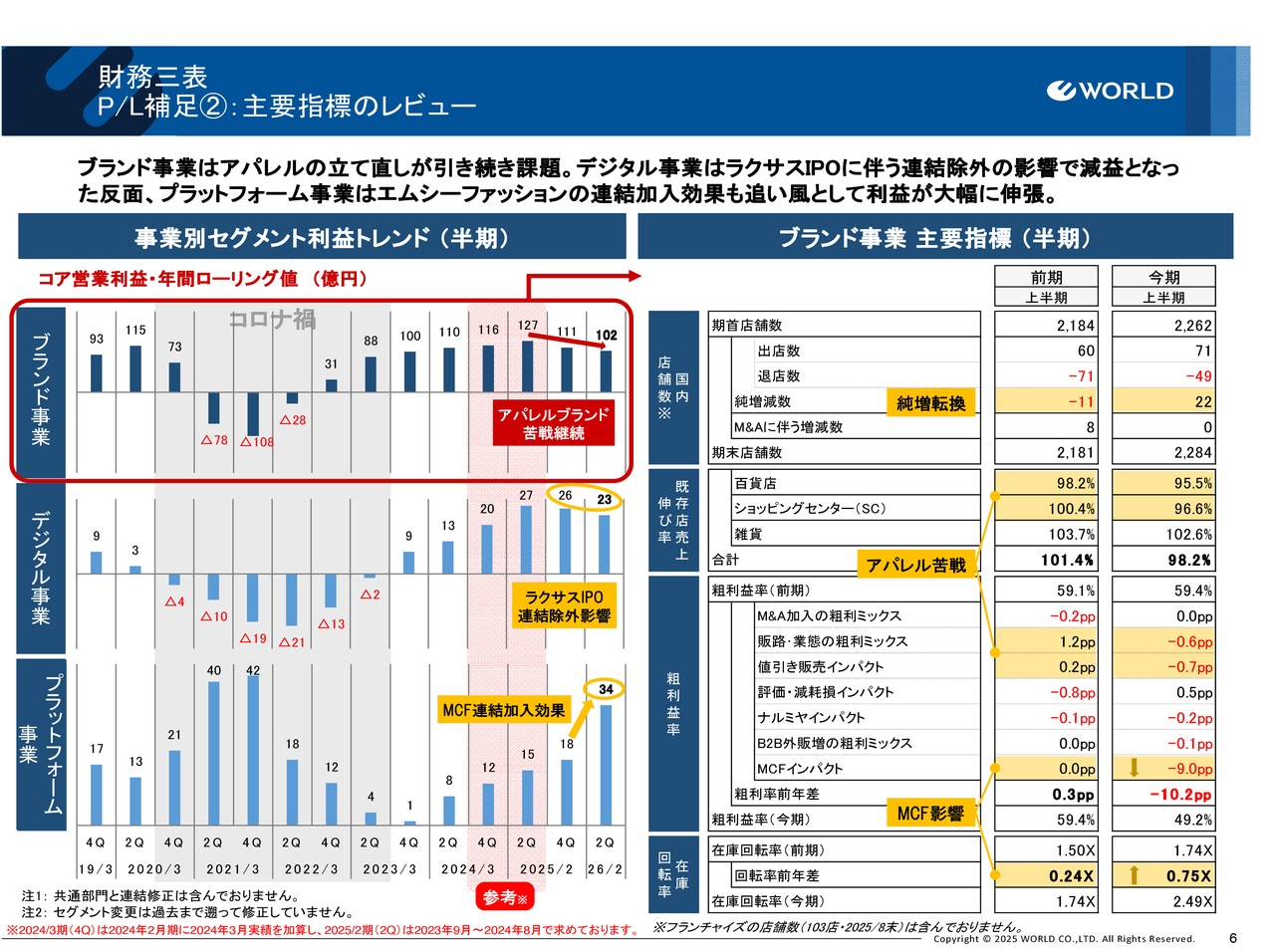 そして、最下段のプラットフォーム事業は、エムシーファッションの連結加入効果もあり、利益が34億円と大きく伸びています。これにより、アパレル依存からの脱却と事業構造の転換が進行している様子が視覚的にもご理解いただけるかと思います。