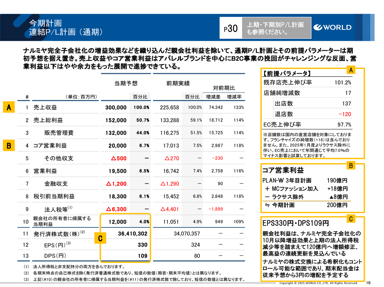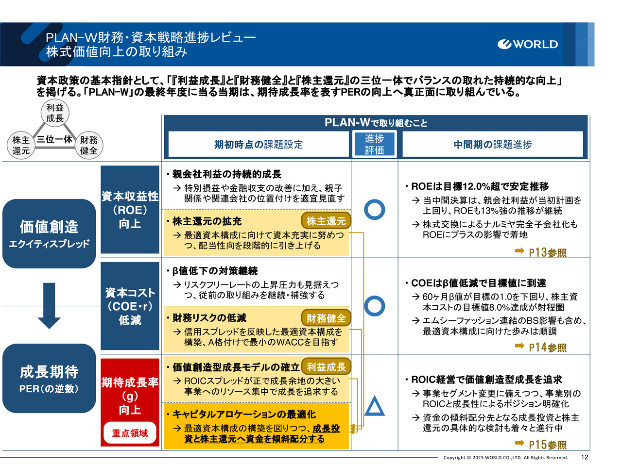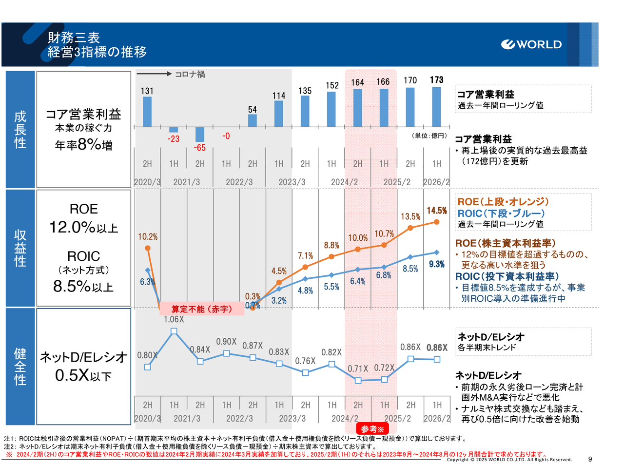 健全性を示すネットD/Eレシオでは、M&A等の影響で一時的に悪化しましたが、ナルミヤの完全子会社化などを通して、再び目標の0.5倍に向けた改善を始動しています。総じて、本業の成長性に一部課題はありながらも、収益性と健全性の改善という「PLAN-W」の基本方針を堅持できていると考えています。