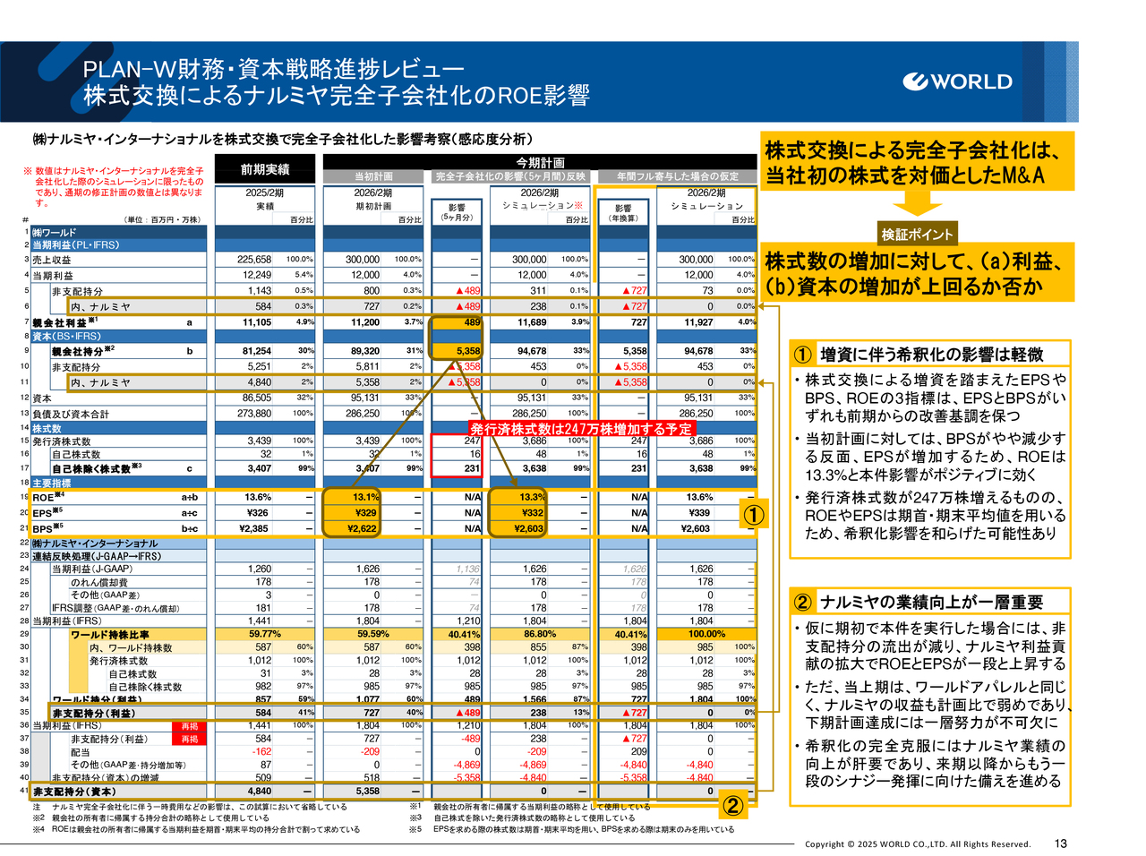 PLAN-W財務・資本戦略進捗レビュー 株式交換によるナルミヤ完全子会社化のROE影響