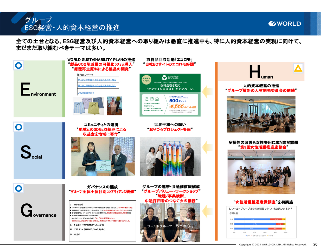 グループとしては、土台となるESG経営や人的資本経営の推進を、愚直に一歩一歩進めています。特に、スライド右側に記載の人的資本経営の実現については、まだ多くの課題があると認識しています。当社は女性が多い職場であることもあり、女性の活躍推進という点ではさらなる取り組みが必要です。現在、この活動を強化しているところです。