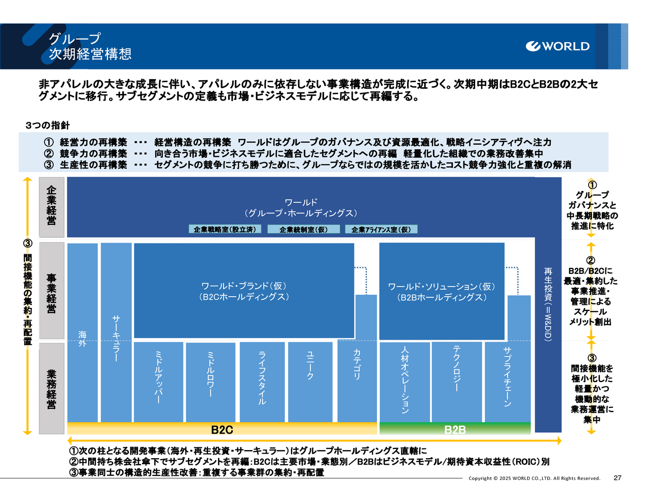 次期中期の体制は大きく分けて以下のようになります。スライド左側に示されていますように、企業経営については、グループ全体を統括する「ワールド(グループ・ホールディングス)」が担い、事業経営は「ワールド・ブランド(仮称)(B2Cホールディングス)」と「ワールド・ソリューション(仮称)(B2Bホールディングス)」が担います。
