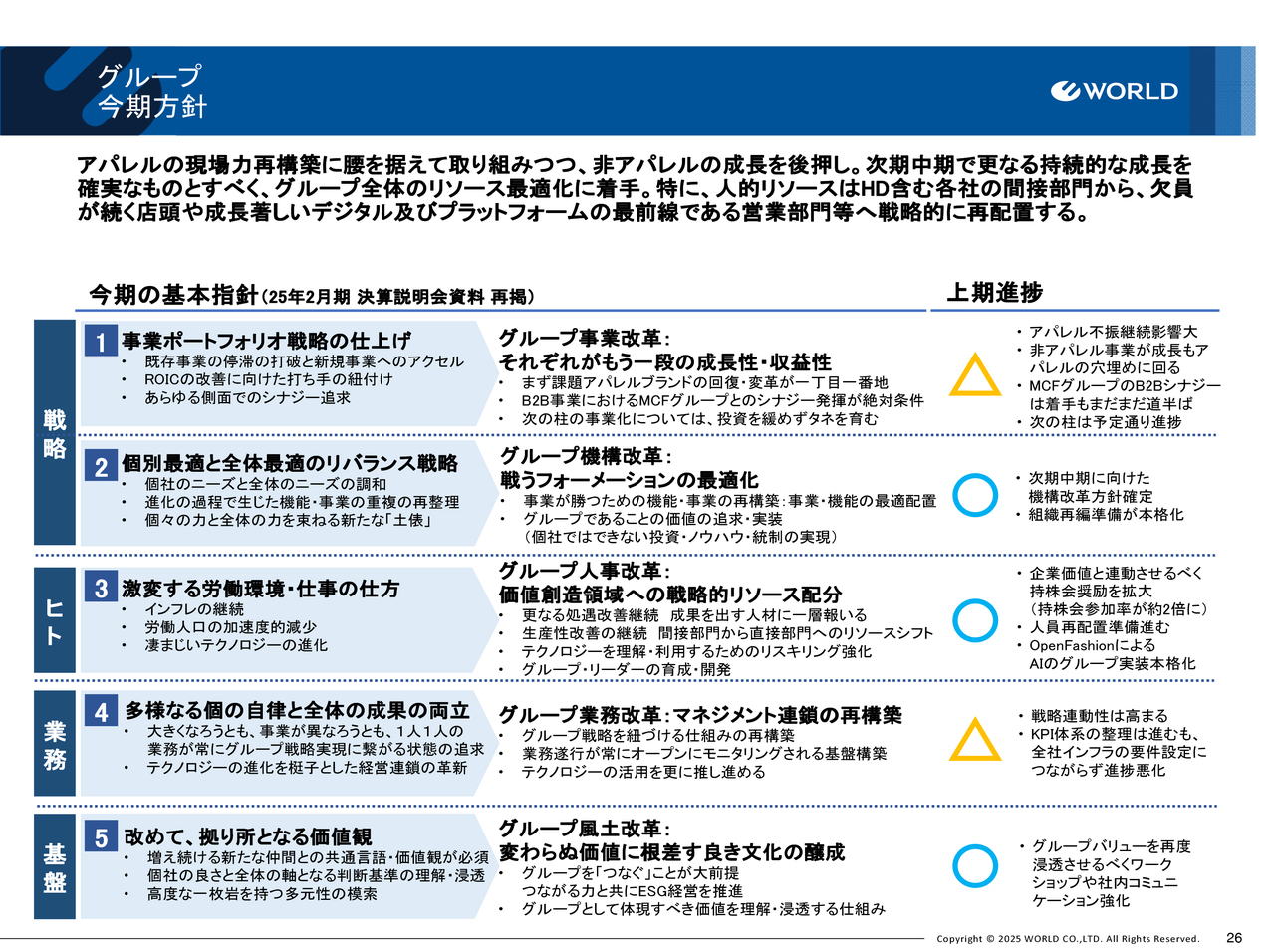 上期はアパレルブランドに明確な課題を残した一方で、ポートフォリオ転換の成果と財務戦略における着実な進捗を確認できた半期となりました。下期では残された課題に正面から取り組み、必ず通期計画を達成し、来期から始まる新中期計画に臨めるよう準備を整えていきます。