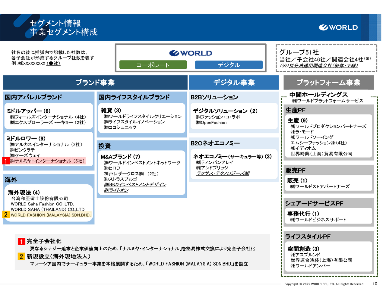 これらすべてのセグメントに共通する、いわゆるシナジーの創出については、先ほどご説明しましたナルミヤの完全子会社化が大きな要素です。これにより、一層の成長投資とコスト合理化が進むことで、シナジーを発揮できる段階に入っています。
