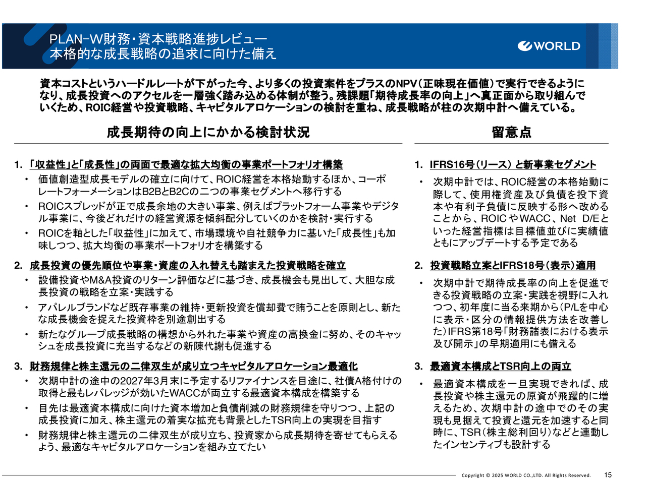 PLAN-W財務・資本戦略進捗レビュー 本格的な成長戦略の追求に向けた備え