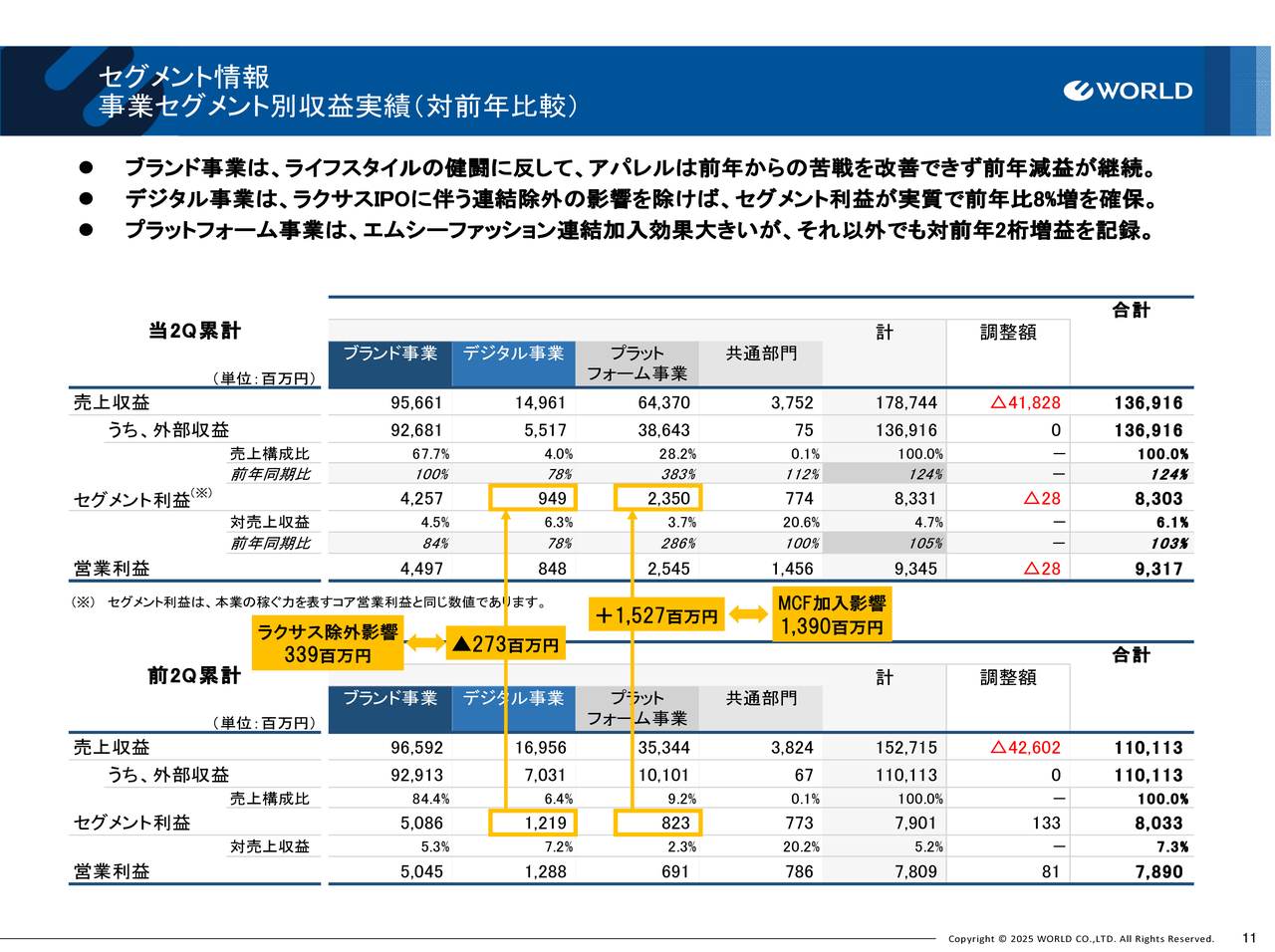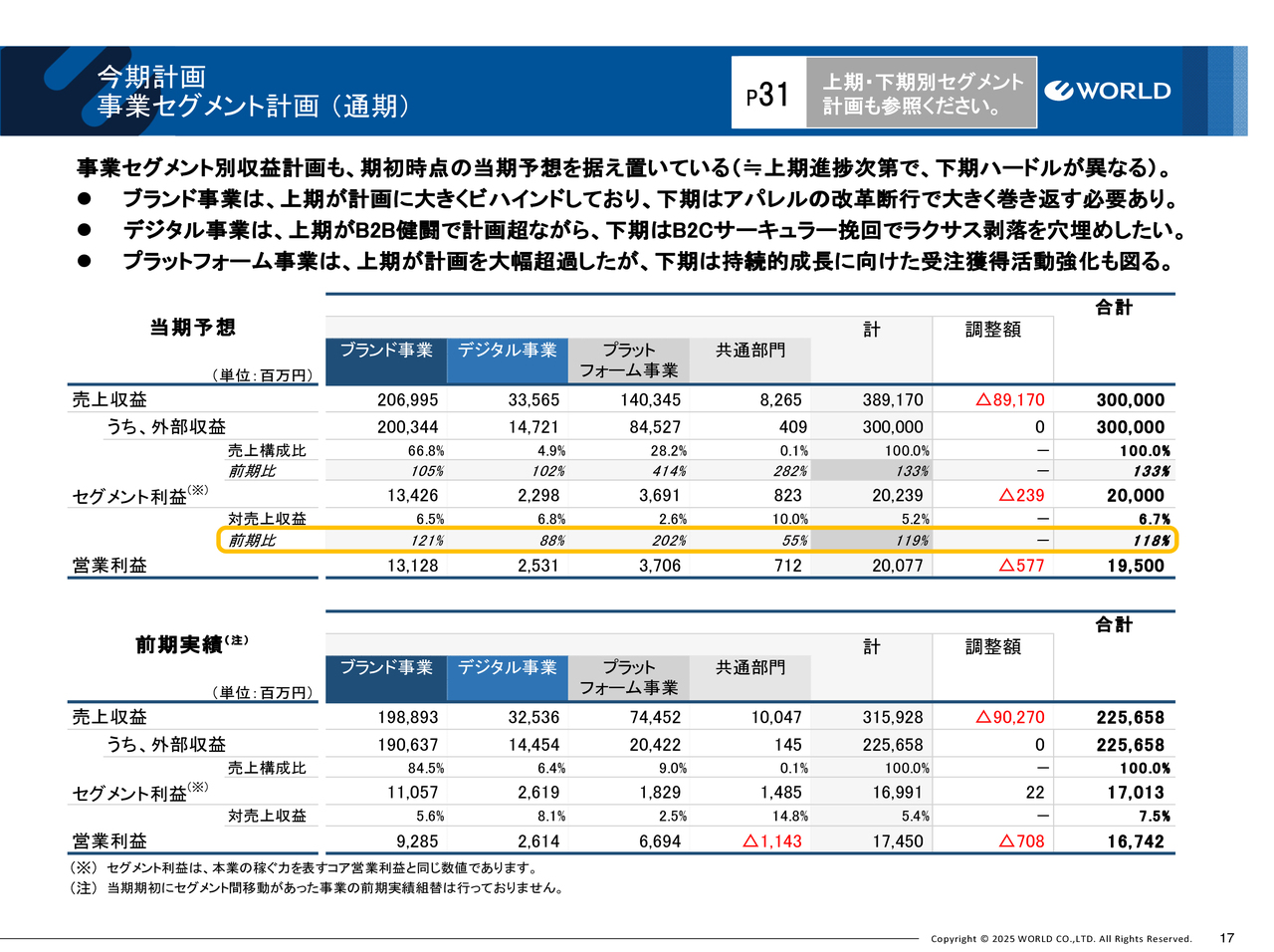 事業セグメント別計画については、期初予想を据え置いています。ブランド事業においてアパレルを中心に大きな挽回を果たすことが、会社計画達成の鍵となりますが、上期の良好な結果を踏まえれば、デジタル事業とプラットフォーム事業にはまだ大きな伸びしろがあると考えています。