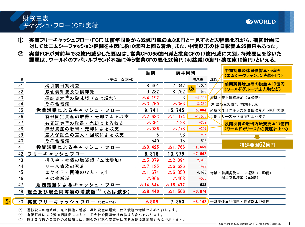 これらを調整した実力値ベースで比較すると、キャッシュ創出力は好調だった前期と遜色ないレベルを維持していると考えています。ただし、唯一の課題として、アパレル不振に伴う営業キャッシュフローの悪化が20億円あり、その内訳は利益減が10億円、在庫増が10億円です。この点については、当社として真摯に受け止めるべき課題であると認識しています。