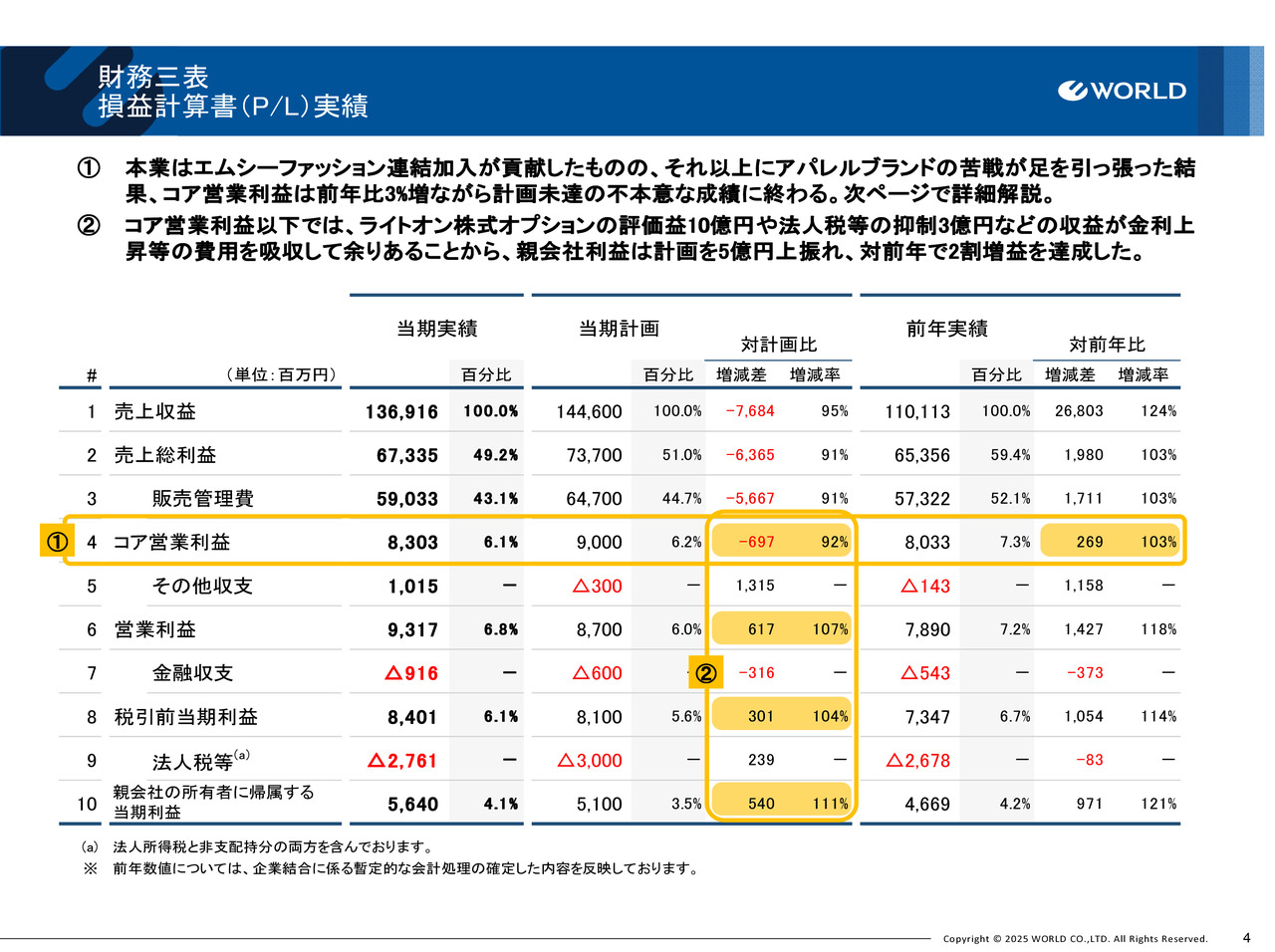 まず、課題についてご説明します。スライド中央の①コア営業利益をご覧ください。実績は83億円となり、期初計画の90億円に対して7億円、率にして8パーセントの未達という不本意な結果に終わりました。これは主にアパレルブランド事業が春夏シーズンを通じて販売苦戦したことが響いています。