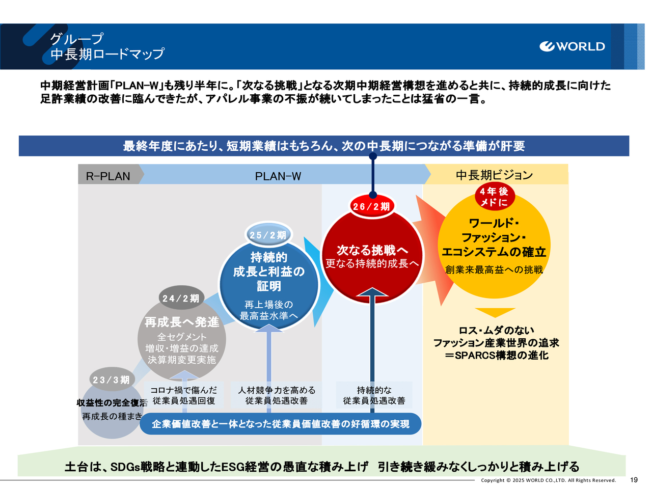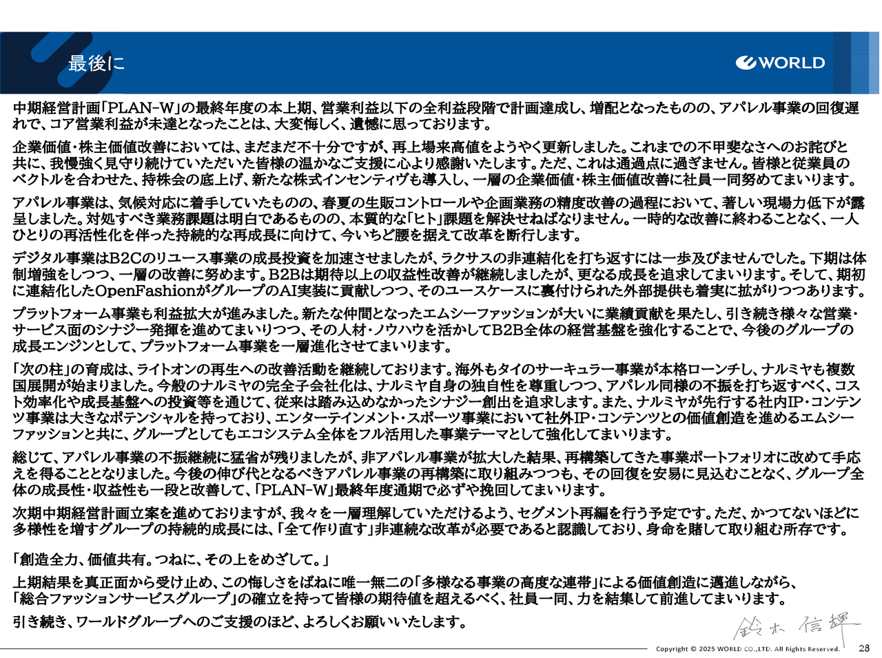 総じて、アパレル事業の不振継続には課題が残りましたが、事業ポートフォリオの再構築にあらためて手応えを感じています。今後は、伸びしろとなるべきアパレル事業の再構築に取り組みつつ、その回復を安易に見込むことなく、グループ全体の成長性と収益性を一段と改善し、最終年度の通期で必ずこの「PLAN-W」を挽回していきたいと考えています。