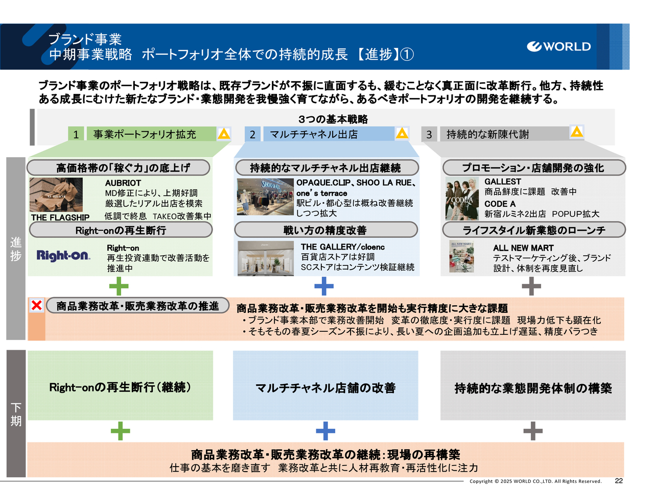 上期の進捗はスライドのとおりです。まず、戦略については、「△」はアパレルに関する課題を表しています。また、エムシーファッショングループとのシナジーについては、まだこれからという状況です。その下に記載があるように、後ほど詳しく説明しますが、グループの機構改革に向けた準備を進めています。