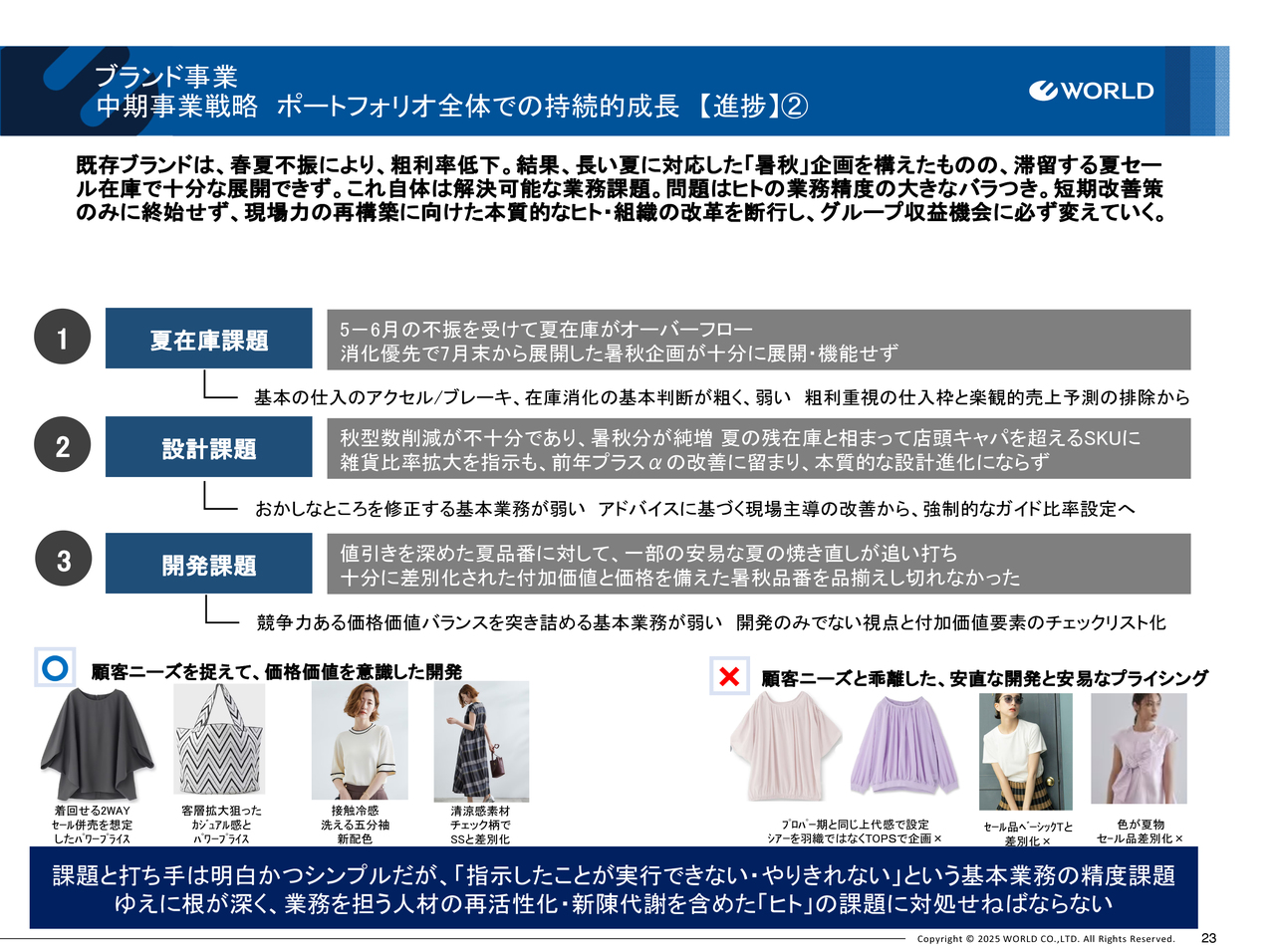 さらに、さまざまな気候対応を進めてきましたが、そもそもの春夏シーズンにおいて不振に陥っており、長い夏への企画をいろいろと追加していたものの、その立ち上げが遅れてしまった点が非常に反省すべきポイントです。