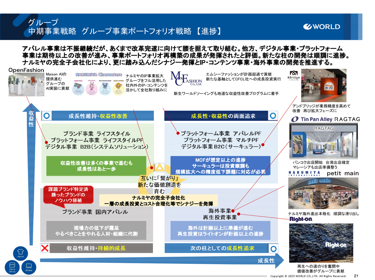 こちらのスライドは、もともと掲げていたグループ事業ポートフォリオ戦略の進捗状況を示しています。縦軸が収益性、横軸が成長性を表しており、最大の課題はスライド左下に「×」と示したとおり、ブランド事業や国内アパレルに課題が残っている点です。