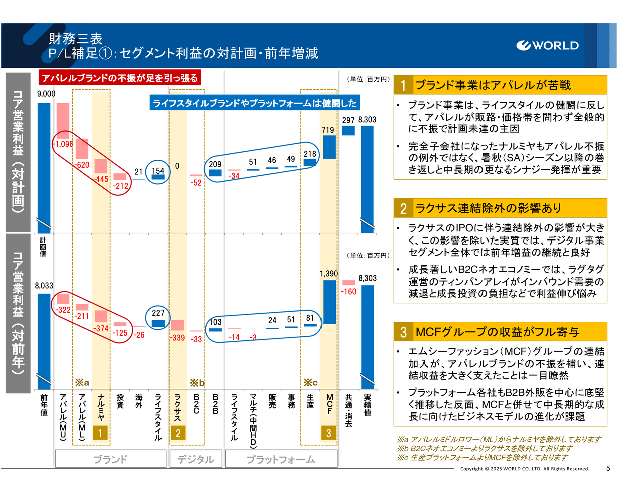 まず、スライド上段の対計画のグラフをご覧ください。計画未達の最大の要因は、ミドルアッパーおよびミドルロワーといったアパレル事業のマイナス17億円です。これにナルミヤ・インターナショナル(以下、ナルミヤ)を加えるとマイナス20億円以上となり、実際にはライフスタイルブランドやデジタルB2Bソリューションでそれぞれ約2億円の上振れや、プラットフォーム事業の計画超過10億円などを相殺してしまいました。