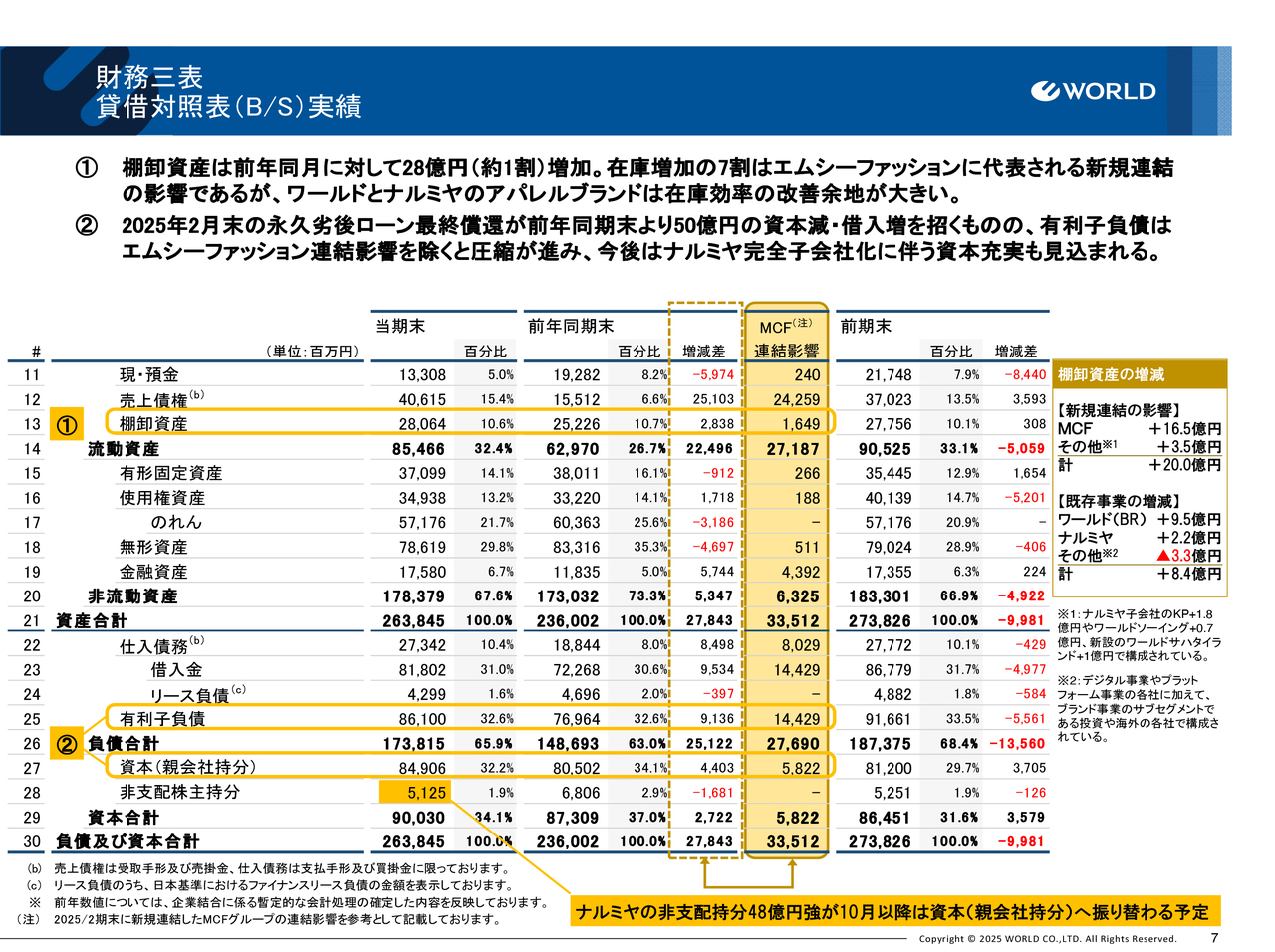 まず、①の棚卸資産については前年同月比で約28億円増加していますが、スライド右側の内訳をご覧ください。増加額の約7割である20億円はエムシーファッションなどの新規連結の影響で、既存事業での増加分は8億4,000万円です。ただし、この内訳の中で、ワールドとナルミヤのアパレルブランドにおける在庫が増加しているため、アパレルの在庫効率改善は喫緊の課題として認識しています。