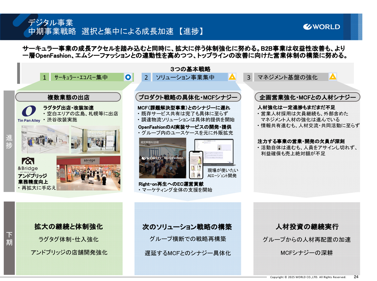 デジタル事業についてです。まず、1番目の「サーキュラー・エコノミー集中」に関連し、「RAGTAG」の出店をかなり加速しました。空白エリアでの新規出店はもちろん、渋谷などの中心エリアの店舗改装も実施しました。また、「&Bridge」では業務精度を高めつつ、再拡大への手応えを感じています。