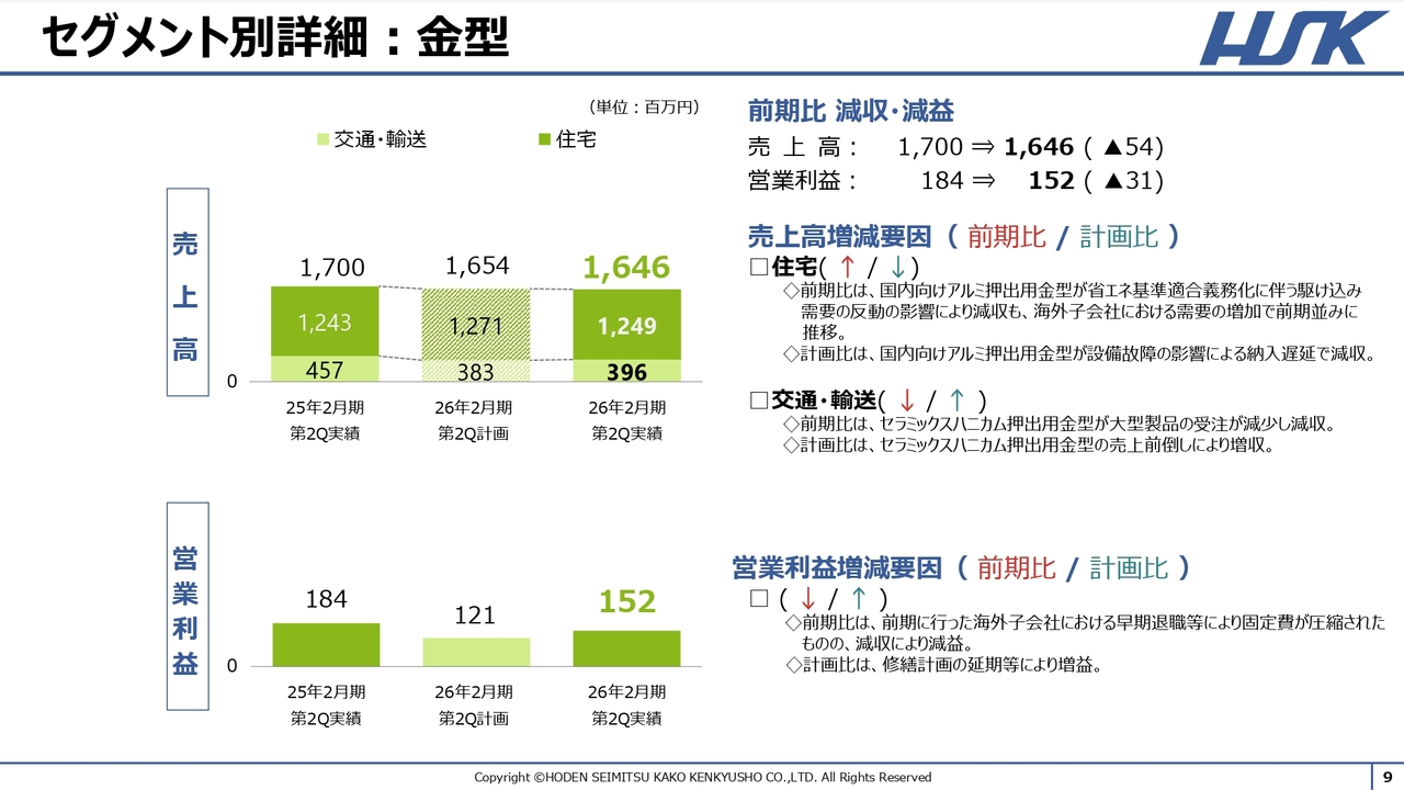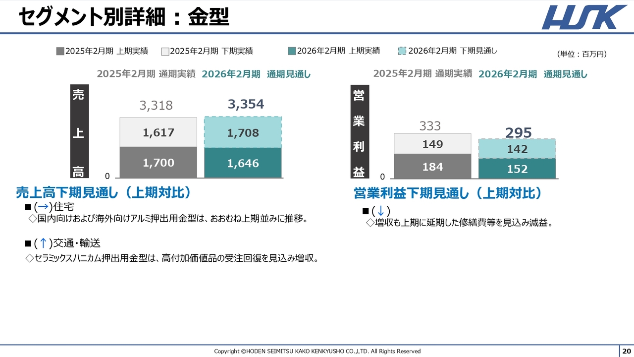 金型セグメントについてご説明します。住宅分野における国内向けおよび海外向けのアルミ押出用金型は、おおむね上期並みに推移すると見込んでいます。セラミックスハニカム押出用金型については、高付加価値品の受注が回復し、増収を見込んでいます。