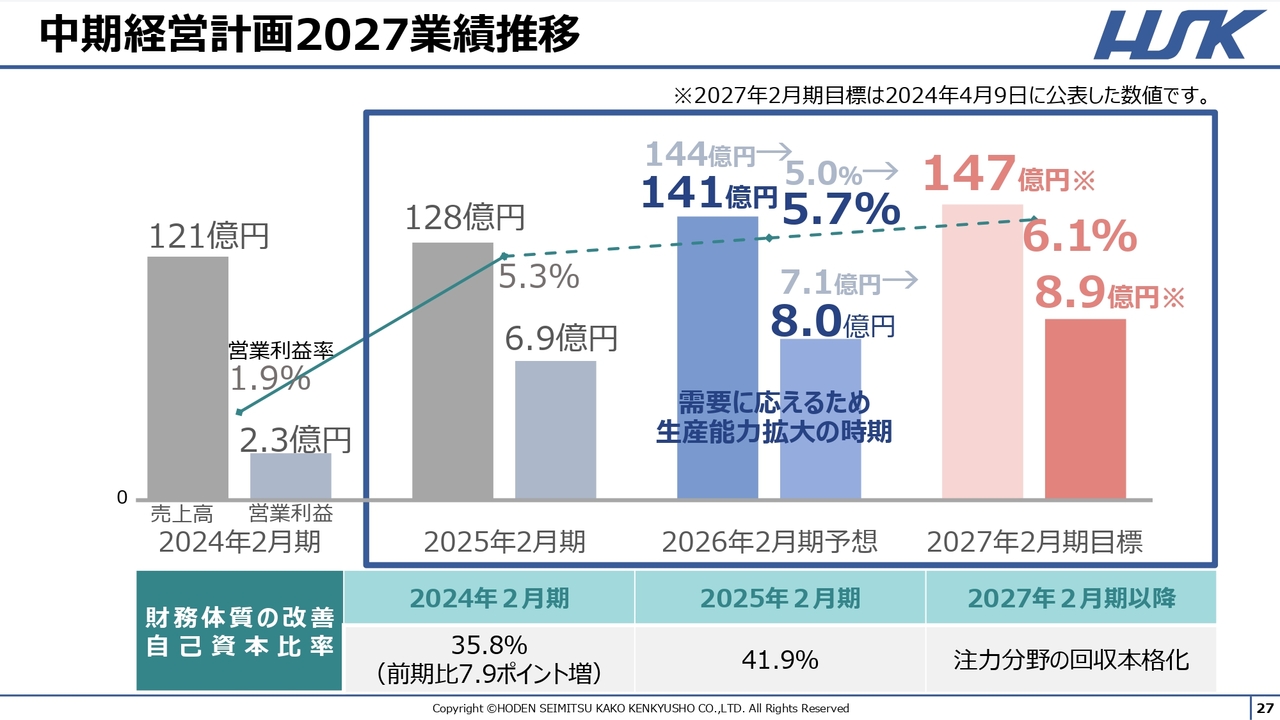 なお、最終年度の2027年2月期については、2024年4月9日に公表した数値を据え置き、売上高147億円、営業利益率6.1パーセントを目標に進めていきます。