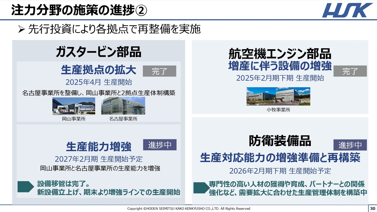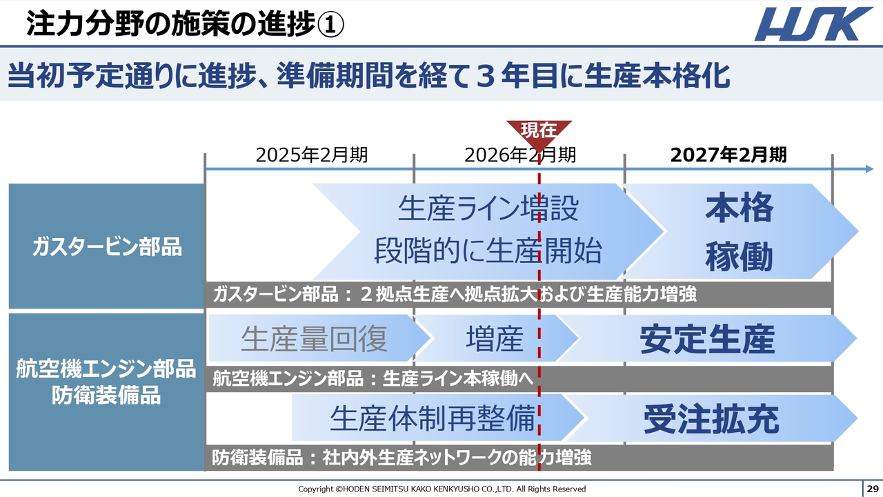 1つ目として、成長分野であるガスタービン部品と防衛装備品については、生産能力拡大に向けた活動を推進しています。