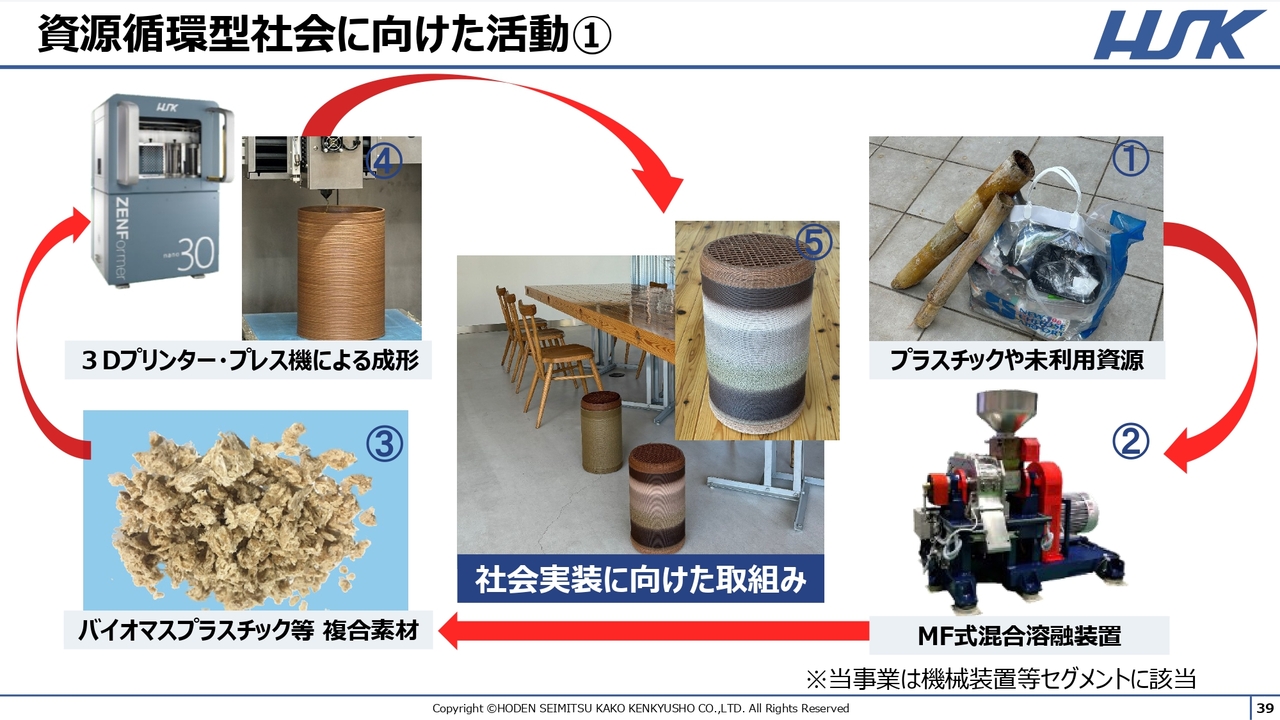 最後に、当社の環境関連事業の進捗状況についてご説明します。プラスチックと未利用資源を混合し、新たな材料を作り出す混合溶融技術は、産学官のさまざまな企業や団体から評価を得ています。現在は、出来上がった材料をどのように活用するか、社会実装に向けた検討が進められています。
