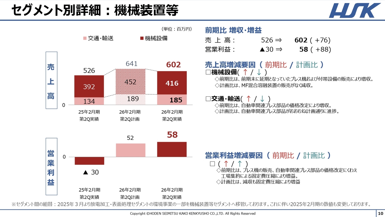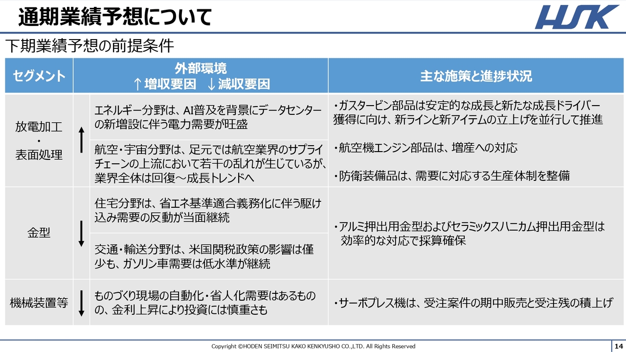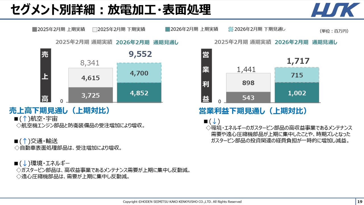 放電加工・表面処理セグメントの外部環境は、増加トレンドに変わりはありません。ガスタービン部品および防衛装備品は、増産に向けた体制整備を進めています。上期では設備の設置は順調に進みましたが、増員の遅れに伴い、今期の体制構築が想定より遅れています。ただし、期末までには体制を整えられるよう取り組んでいます。