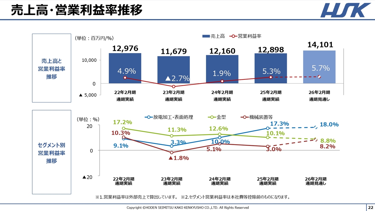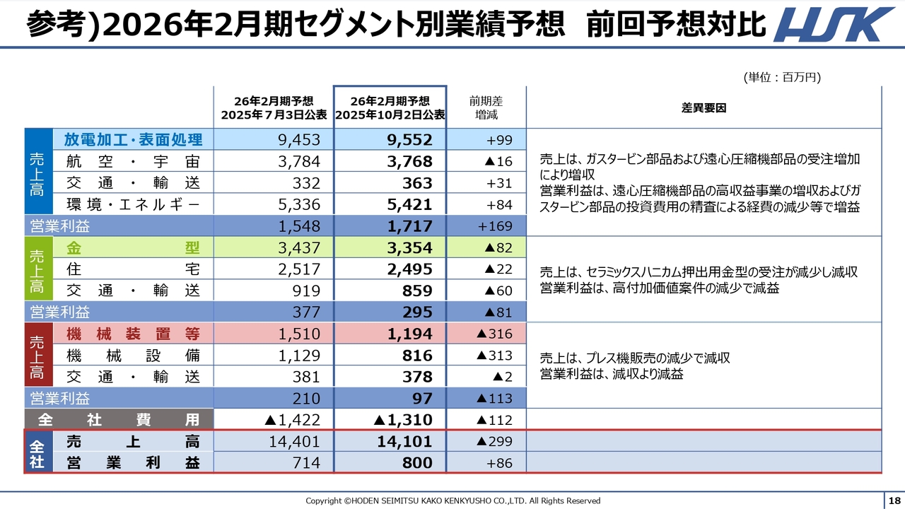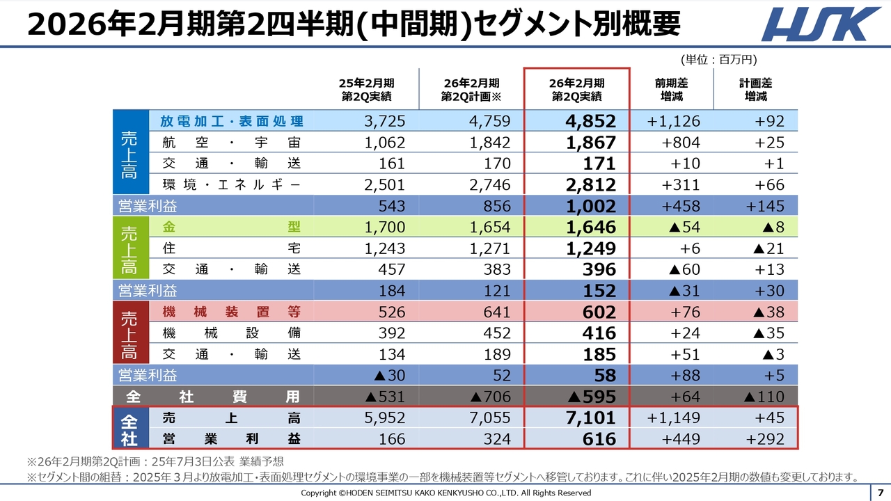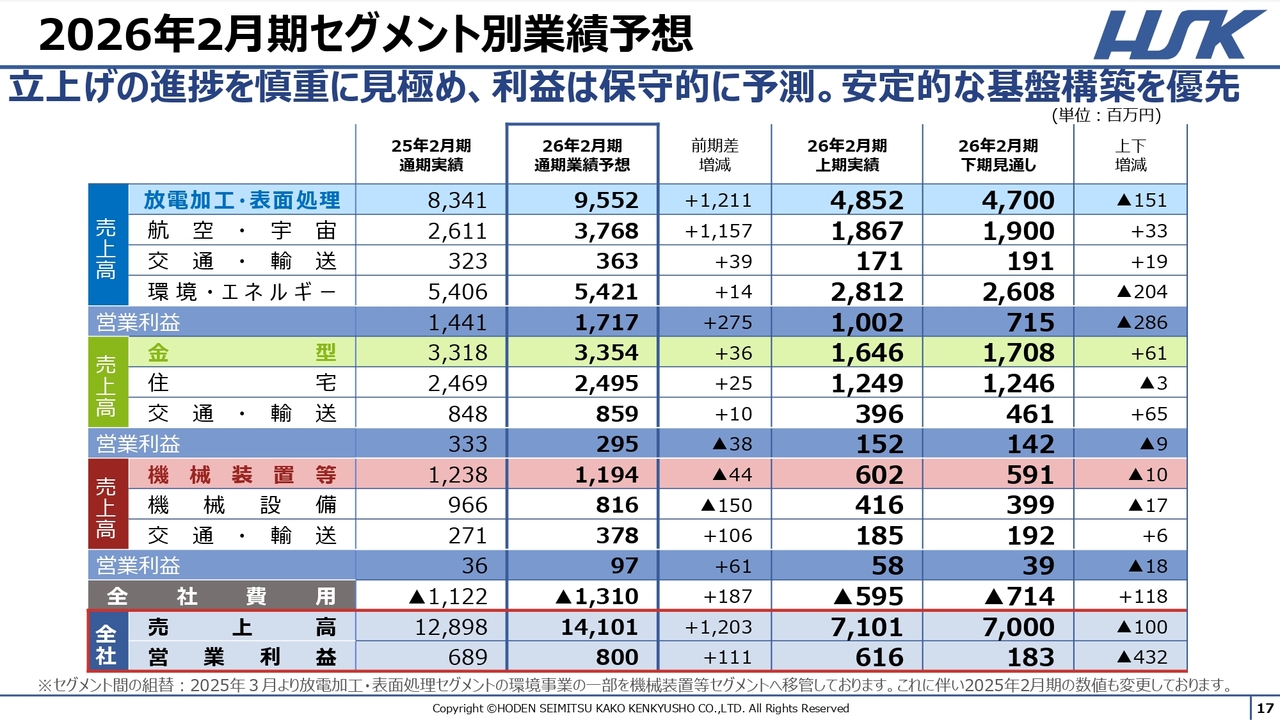 放電加工・表面処理セグメントの外部環境は、増加トレンドに変わりはありません。ガスタービン部品および防衛装備品は、増産に向けた体制整備を進めています。上期では設備の設置は順調に進みましたが、増員の遅れに伴い、今期の体制構築が想定より遅れています。ただし、期末までには体制を整えられるよう取り組んでいます。