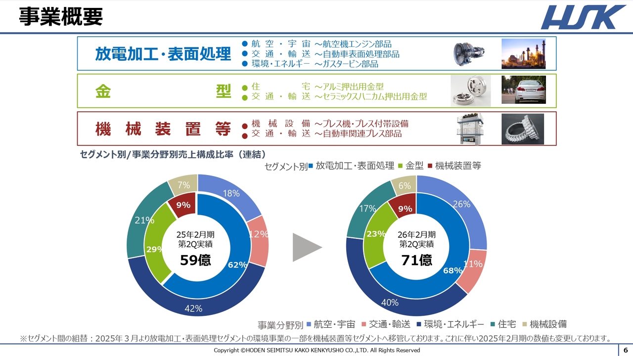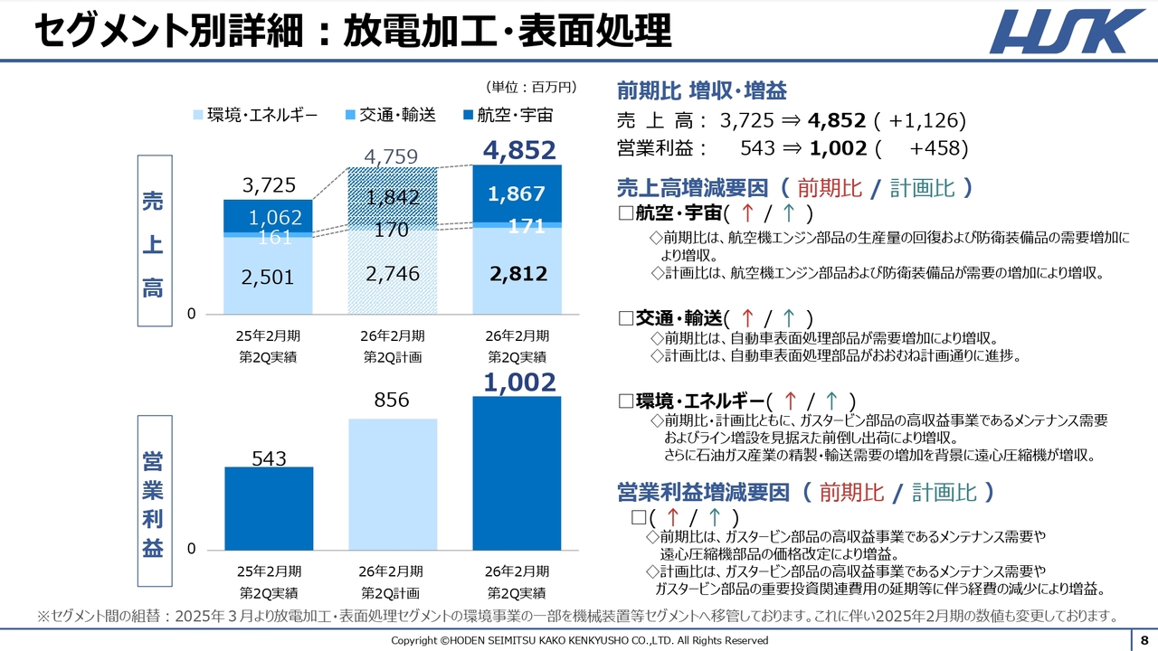 これらの売上構成比率はスライドのとおりです。航空・宇宙分野が8ポイント増加したことで、放電加工・表面処理セグメントの構成比が68パーセントになりました。