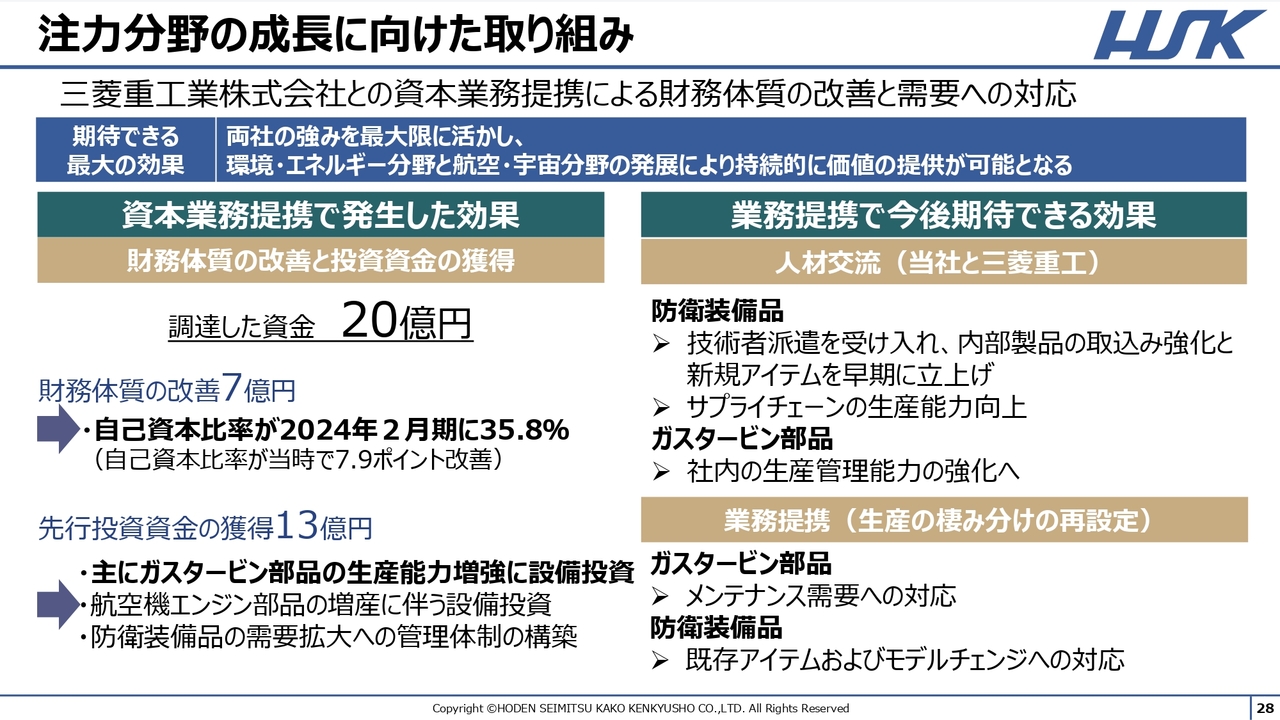 当社は、航空旅客需要の回復および電力需要・防衛装備品需要の高まりに伴い、主要顧客である三菱重工から増産要請を受けました。この要請を機に、2024年1月に三菱重工と資本業務提携を締結しました。これにより、事業基盤と財務基盤の強化を両立させ、生産能力拡大と収益力強化への基盤を構築しました。