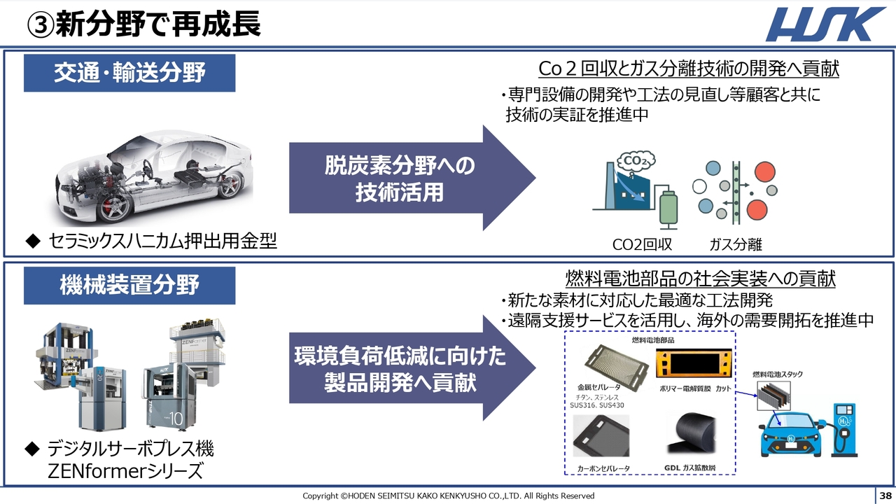 また、当社は金型の製造事業だけでなく、金型を使用する装置の開発にも取り組んでいます。当社の主要製品であるデジタルサーボプレス機は、燃料電池の製造工程において実証が進み、金属だけでなく複合素材への活用も展開されています。これにより、さらなる技術革新と成長の実現を目指します。