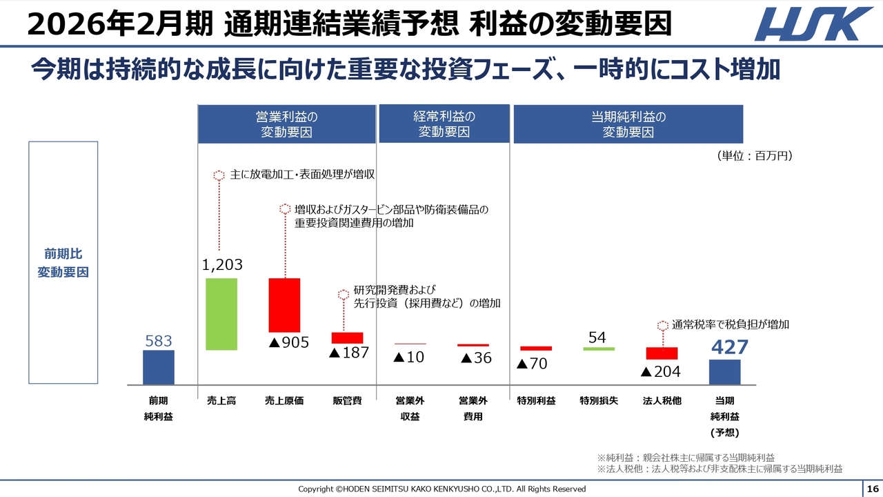 2026年2月期の利益の変動要因を前期比で示したものです。売上高は、放電加工・表面処理セグメントの売上増加により増収を見込んでいます。