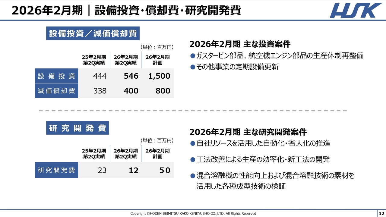 設備投資の主な内容は、ガスタービン部品および航空機エンジン部品の生産体制再整備に向けた投資や、既存設備の定期更新となります。その他の設備投資や研究開発については、事業状況を勘案しながら進めていきます。