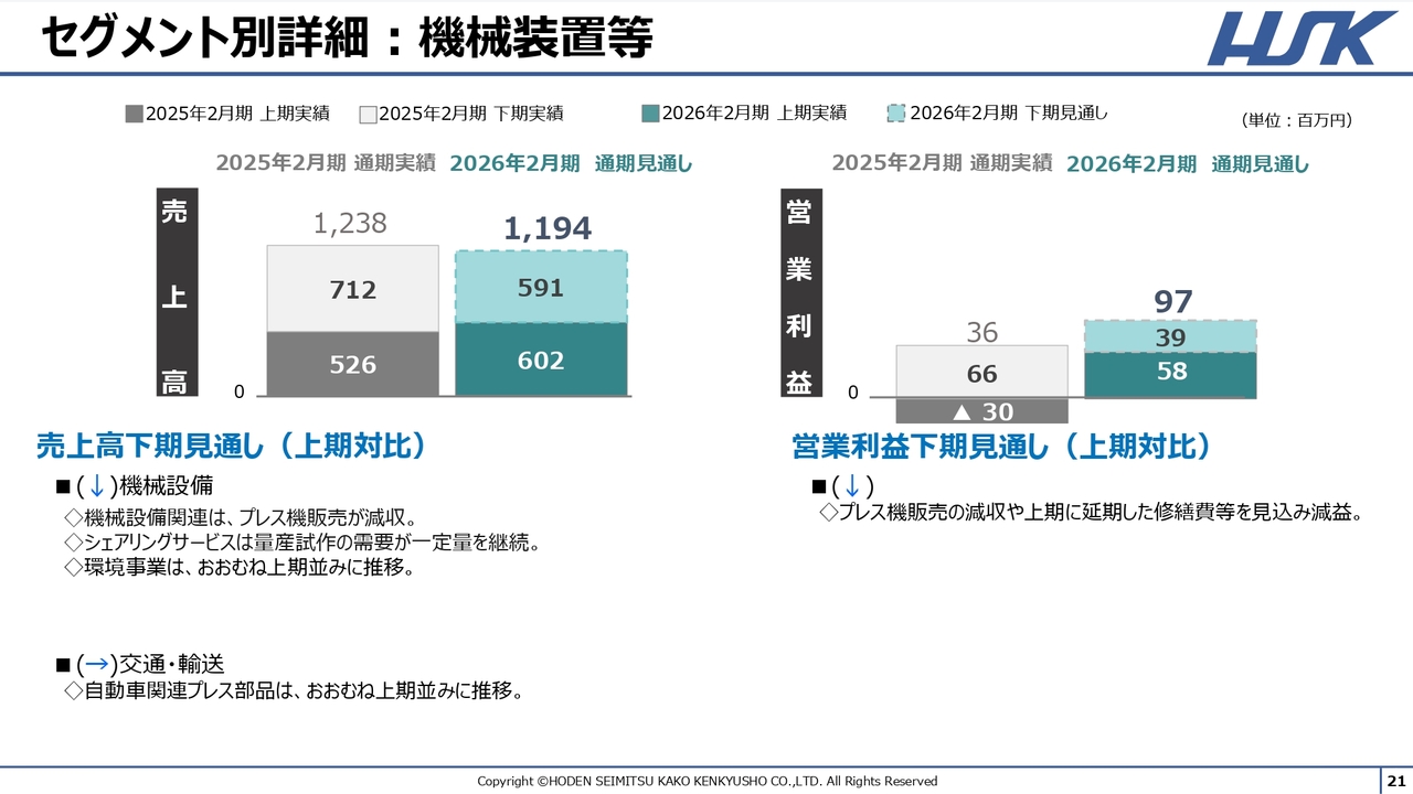 機械装置等についてご説明します。機械装置関連では、プレス付帯設備で自動車産業の設備投資需要の増加や、シェアリングサービス事業で量産試作の需要を見込んでいます。しかし、サーボプレス機の受注状況を踏まえ、セグメント全体では減収を見込んでいます。