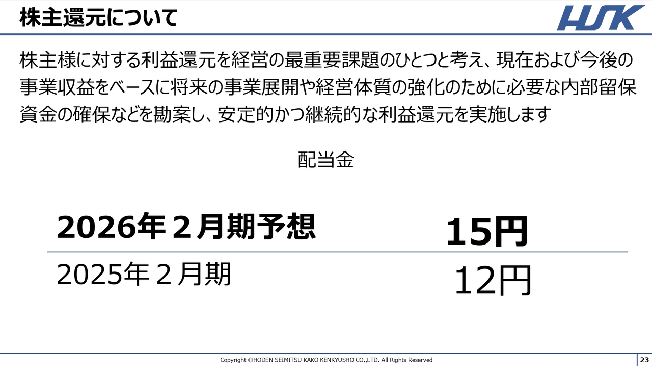 ここで株主還元についてご説明します。当社は長期的な視野に立ち、堅実な成長を続けることを目指しています。株主のみなさまに対しては、安定的かつ継続的な利益還元を経営上の最重要課題と位置づけています。