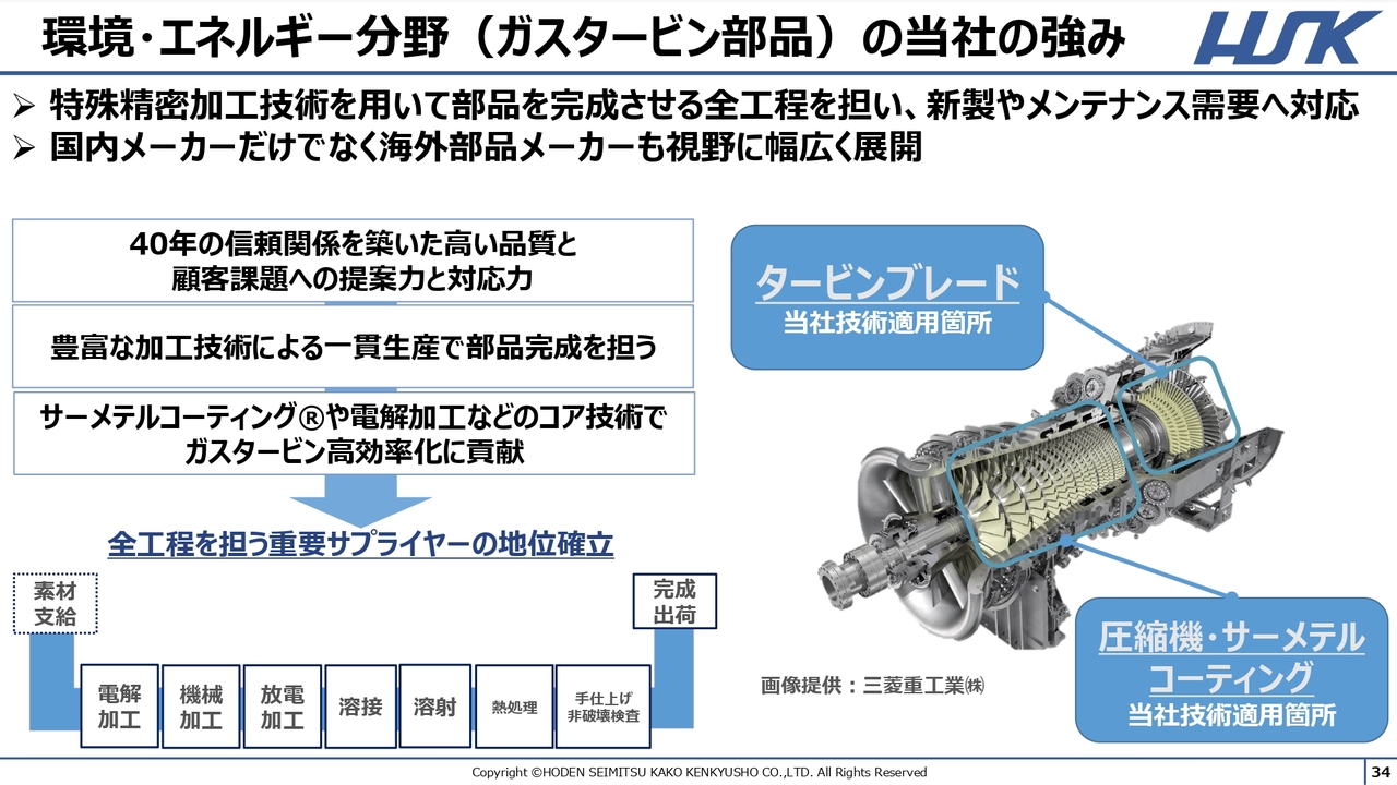 次に、環境・エネルギー分野における当社の強みについてご説明します。天然ガスを燃料とする火力発電のガスタービン部品では、40年の信頼関係を築いた高い品質と、顧客課題への提案力・対応力があります。