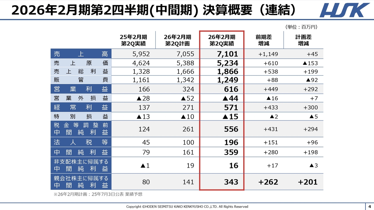 本資料のポイントはスライドのとおりです。2026年2月期第2四半期の売上高は71億100万円で、前期比19.3パーセント増、営業利益は6億1,600万円で、前期比3.7倍と大幅に増益となりました。また、親会社株主に帰属する中間純利益は3億4,300万円となりました。