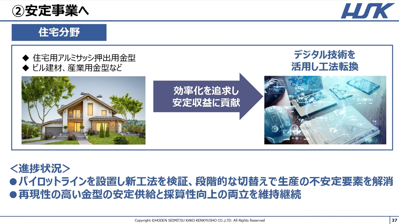 次に、安定事業と位置づけている住宅分野についてです。ここでは、住宅の窓枠などに使用されるアルミサッシを製造するための金型を生産しています。金型は、大量生産に欠かせない工具であり、もの作りの技術が集大成された非常に価値の高いものです。