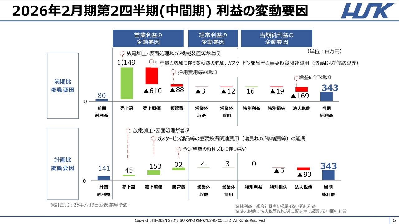 まず、上段の前期比についてです。売上高は、放電加工・表面処理セグメントと機械装置等セグメントの売上増加により増収となりました。売上原価については、生産量の増加に伴う変動費の増加や、ガスタービン部品等の重要投資に関連する費用の増加が要因です。販売管理費は、投資に伴う採用費用の増加などによるものです。