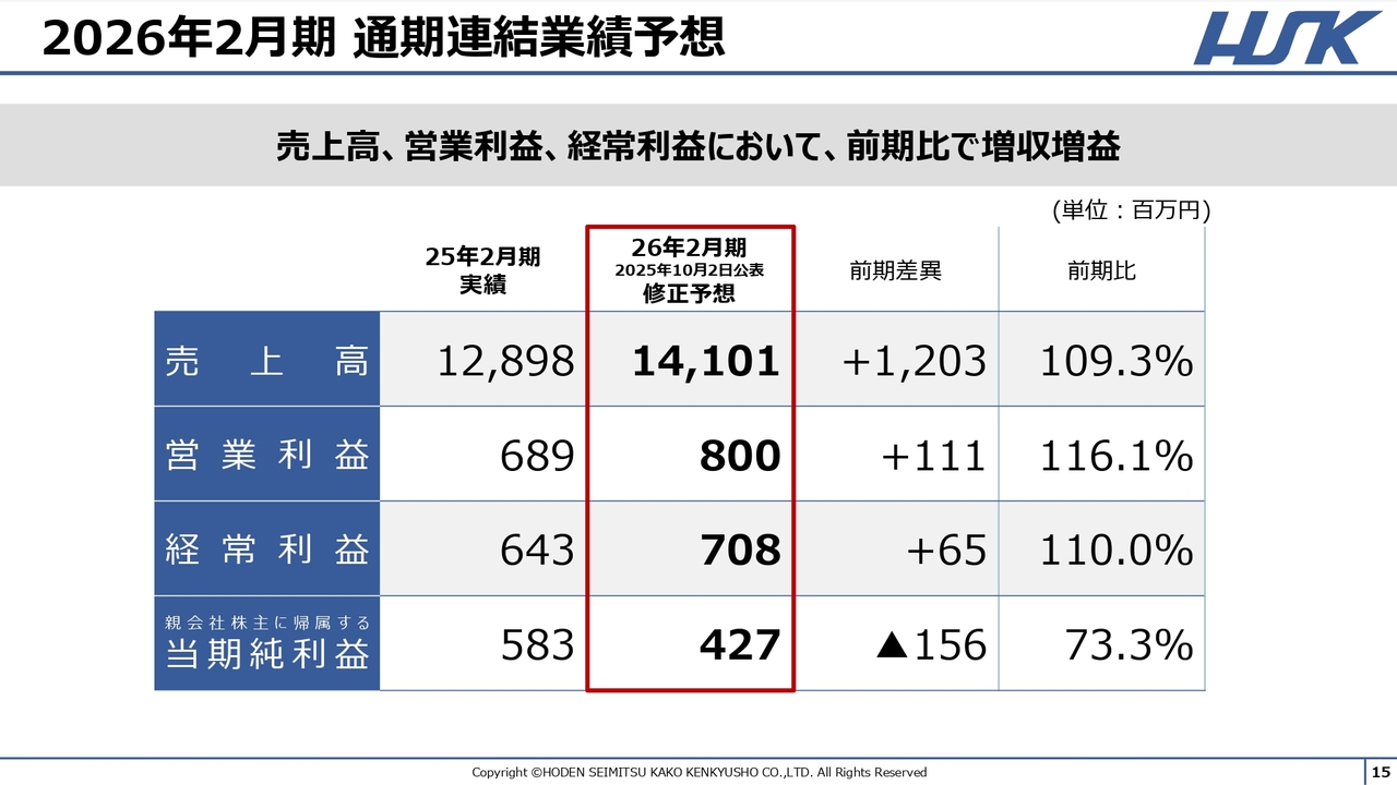 以上を踏まえ、通期連結業績予想を10月2日に修正しました。これにより、売上高は141億100万円、営業利益は8億円、経常利益は7億800万円、親会社株主に帰属する当期純利益は4億2,700万円となる見通しです。営業利益は売上高の伸びを上回る利益成長となる見通しです。