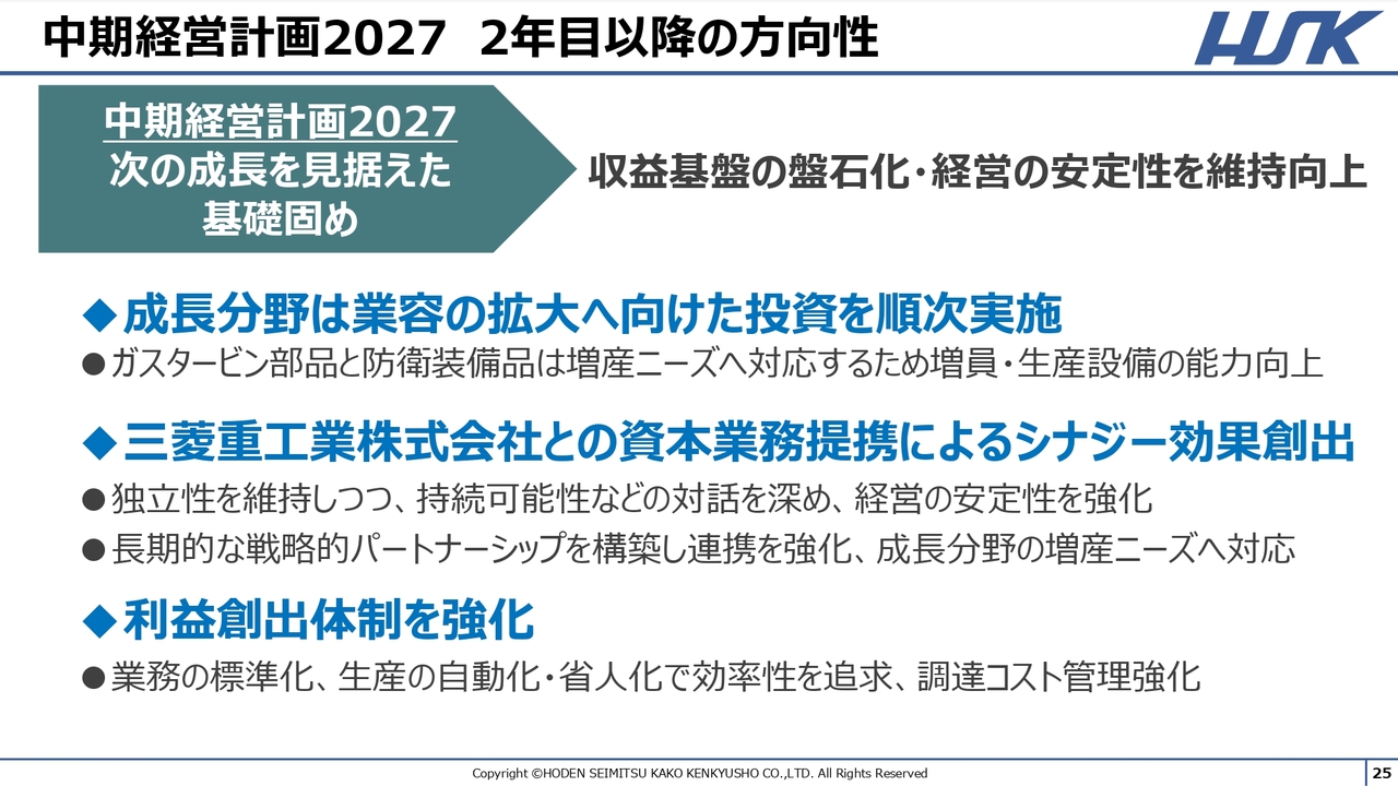2つ目は、三菱重工との資本業務提携によるシナジー効果の創出です。当社は昨年1月に三菱重工と資本業務提携を締結し、コミュニケーションの機会が増加しています。これにより、営業情報のレベルを向上させ、成長分野の増産ニーズに対応しています。