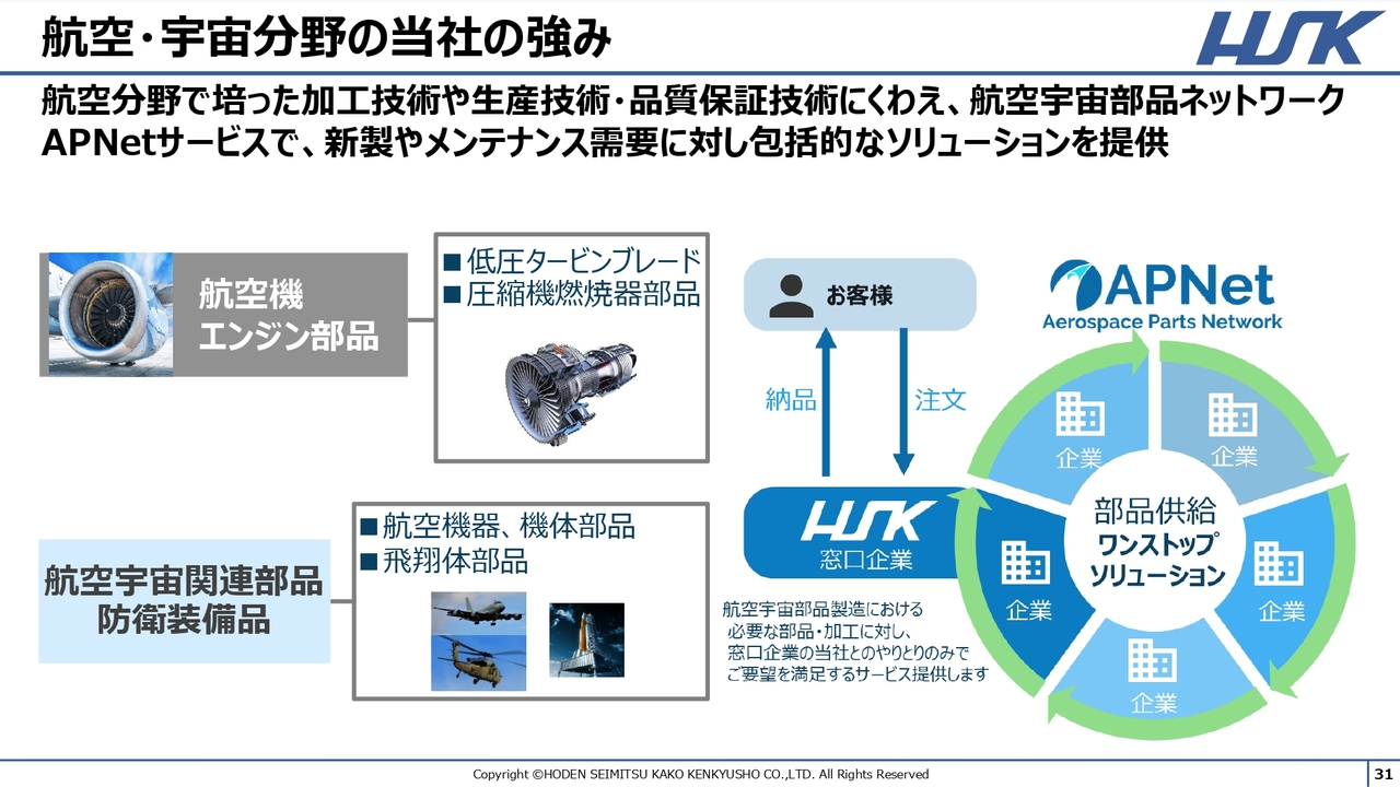 当社の航空・宇宙分野の強みについてあらためてご説明します。航空・宇宙分野において、当社は60年以上の実績を有しています。この分野で培った加工技術、生産技術、品質保証技術に加え、幅広い部品供給を可能にする航空宇宙部品ネットワーク「APNetサービス」など、包括的なソリューションを提供しています。